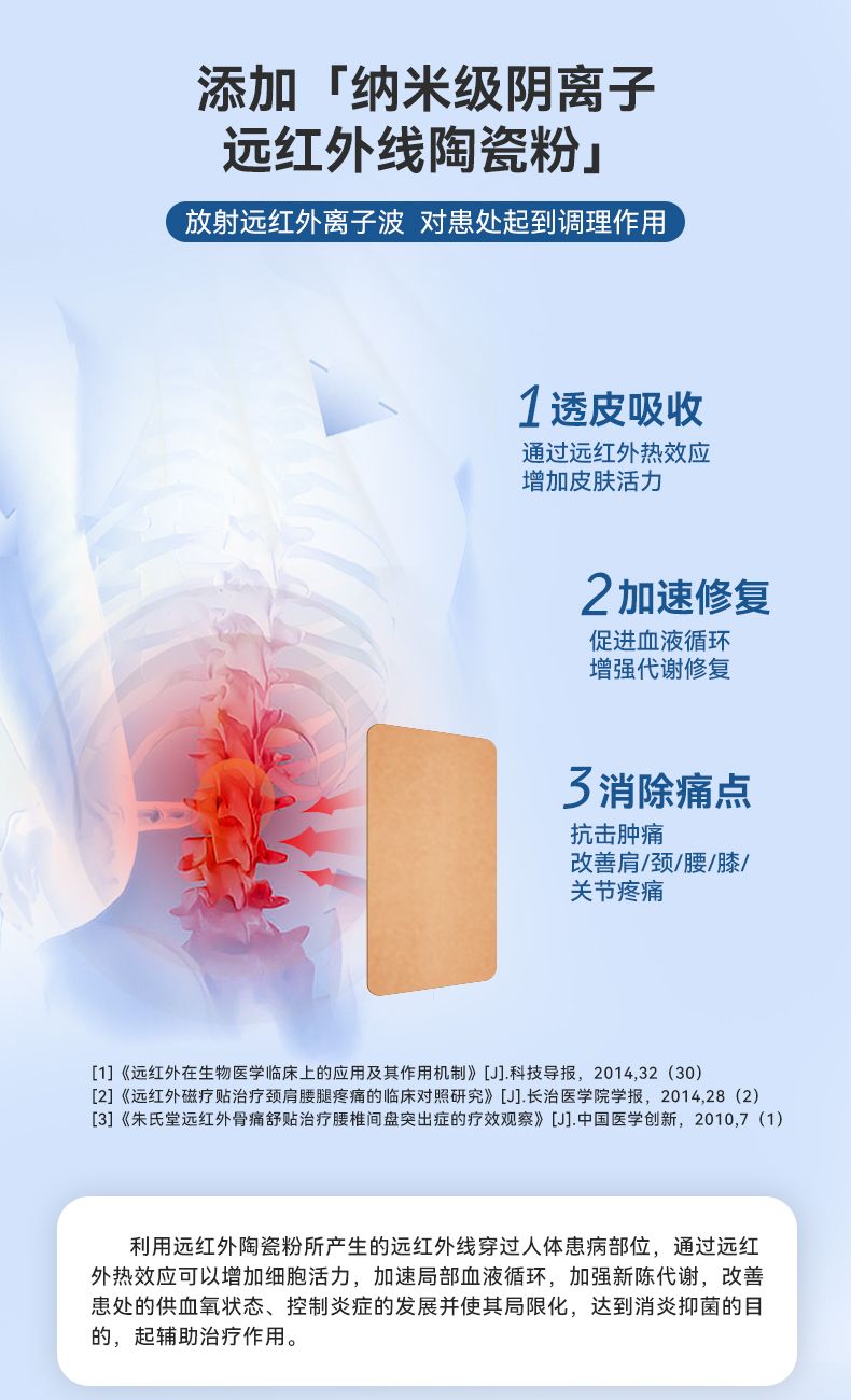 作用機(jī)理 利用遠(yuǎn)紅外陶瓷粉所產(chǎn)生的遠(yuǎn)紅外線穿過人體患病部位,通過遠(yuǎn)紅外熱效應(yīng)可以增加細(xì)胞活力,加速局部血液循環(huán),加強(qiáng)新陳代謝,改善患處的供血氧狀態(tài)、控制炎癥的發(fā)展并使其局限化,達(dá)到消炎抑菌的目的,起輔助治療作用。