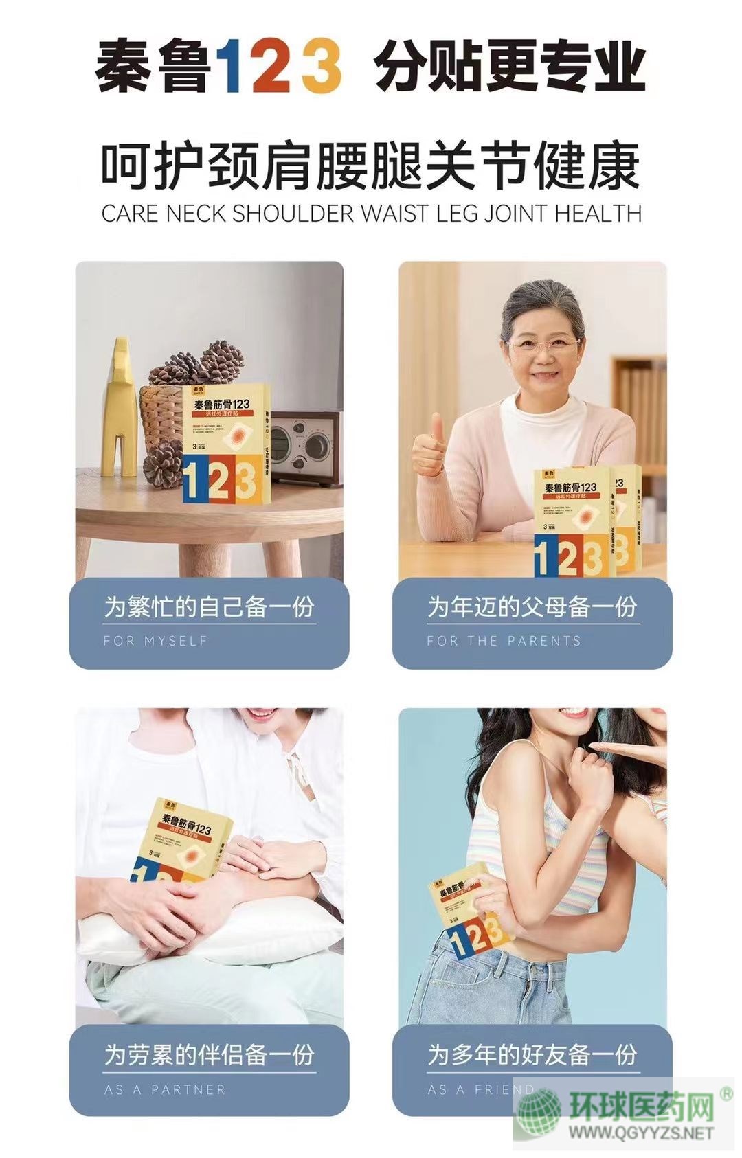 | 產(chǎn)品賣點(diǎn) | ??秦魯筋骨123開創(chuàng)膏藥分貼新理念??腰腿痛、肩頸痛、關(guān)節(jié)痛就選秦魯筋骨123??第1天小藍(lán)貼:倍輕松??第2天小紅貼:靈活動??第3天小黃貼:要鞏固 |