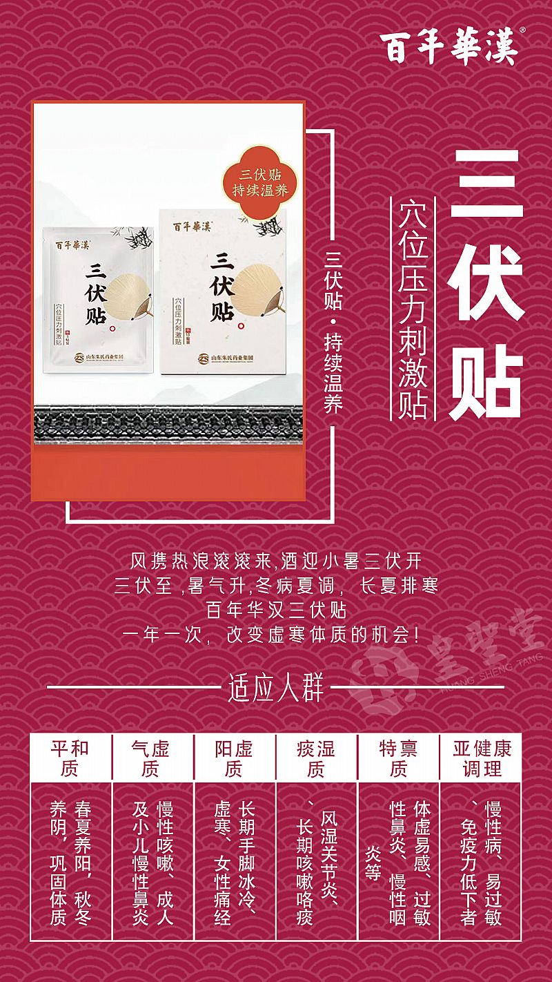 | 作用機(jī)理 | �為么什要貼伏三貼?✔ ✅三伏是年全溫度*高,自界然陽氣盛,人自體身氣循血環(huán)的好時(shí)候 ✅人毛體孔大開,此進(jìn)時(shí)行中貼藥敷,藥物更易容滲透到人體 ✅通藥過物的作用,可激以發(fā)人體正氣,疏經(jīng)通絡(luò)、驅(qū)除人的體陰寒之氣。預(yù)冬防季多發(fā)病發(fā)的生,提高身自體質(zhì) ✅調(diào)身理體的難得機(jī)會(huì)❗ |