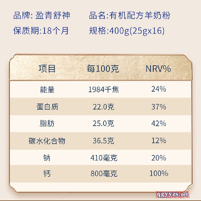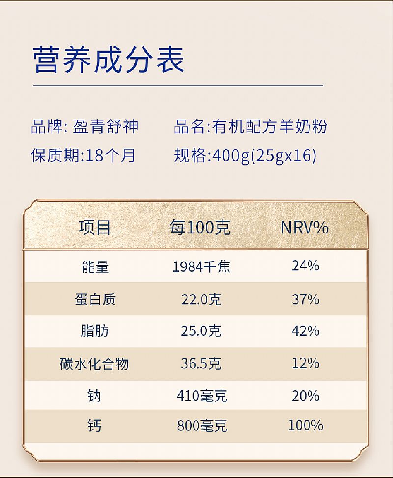 | 主要成分 | 配料表∶有機(jī)生羊乳、有機(jī)菊粉、茶葉茶氨酸(添加量360mg/100g)、磷脂酰絲氨酸(添加量40mg/100g)有機(jī)生羊乳折算有機(jī)羊奶粉添加量不少于90%。有機(jī)益生元以有機(jī)菊粉計(jì),添加量為8g/100g. |