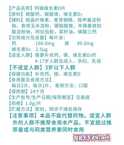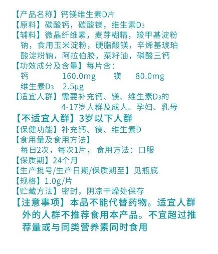 | 作用機(jī)理 | 【適宜人群】需要補(bǔ)充鈣、鎂、維生素D3的4-17歲人群及成人、孕婦、乳母 【不適宜人群】3歲以下人群 【保健功能】補(bǔ)充鈣、鎂、維生素D |