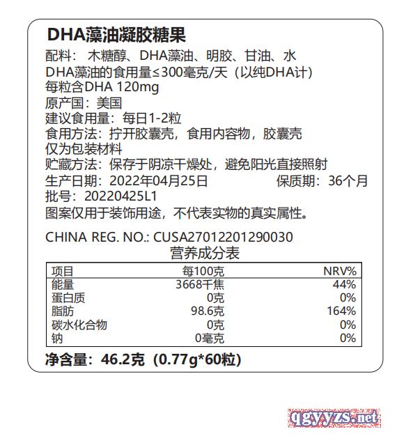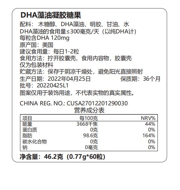 | 產(chǎn)品用途 | 美國原裝進口DHA藻油 產(chǎn)品名稱:DHA藻油凝膠糖果 配料:木糖醇、DHA藻油、明膠、甘油、水 DHA藻油的食用量≤300毫克/天(以純DHA計) 每粒含DHA120mg 原產(chǎn)國:美國 建議食用量:每日1-2粒 食用方法:擰開膠囊殼,食用內(nèi)容物,膠囊殼 僅為包裝材料 貯藏方法:保存于陰涼干燥處,避免陽光直接照射 保質(zhì)期:36個月 批號:20220425L1 圖案僅用于裝飾用途,不代表實物的真實屬性。 CHINAREG.NO.:CUSA27012201290030 營養(yǎng)成分表 項目每100克NRV% 能量3668千焦44% 蛋白質(zhì)0克0% 脂肪98.6克164% 碳水化合物0克0% 鈉0毫克0% 凈含量:46.2克(0.77g*60粒) 美國原裝進口DHA藻油由美國原裝進口。 |