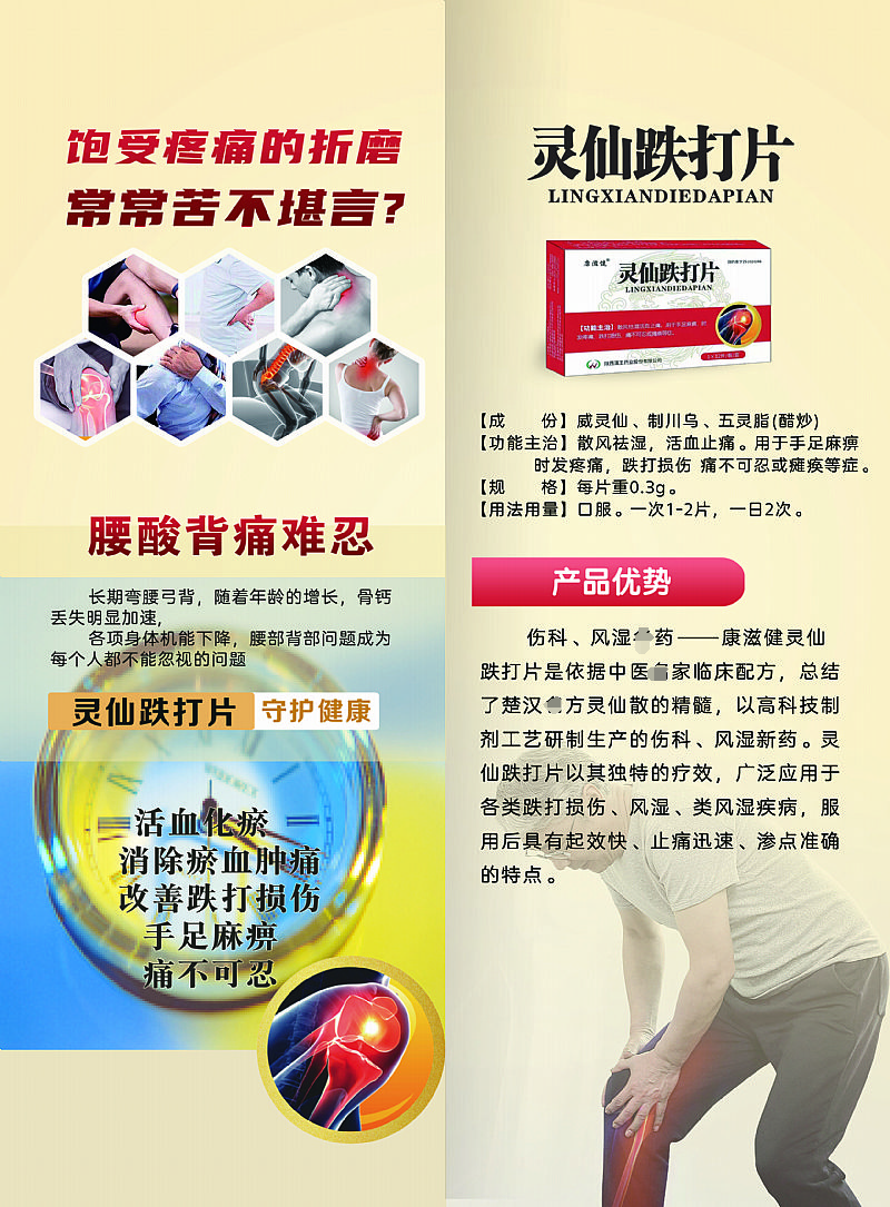 | 產(chǎn)品賣點(diǎn) | 傷科風(fēng)濕明藥-康滋健靈仙跌打片用于各類跌打損傷、風(fēng)濕、類風(fēng)濕、疾病具有止痛快、止痛迅速、滲點(diǎn)準(zhǔn)確特點(diǎn) |