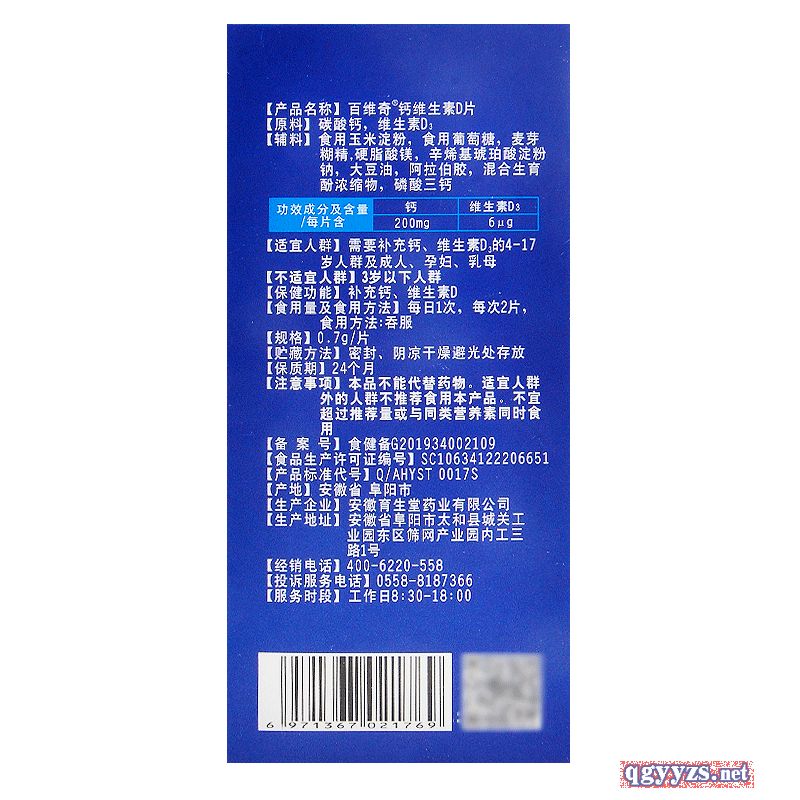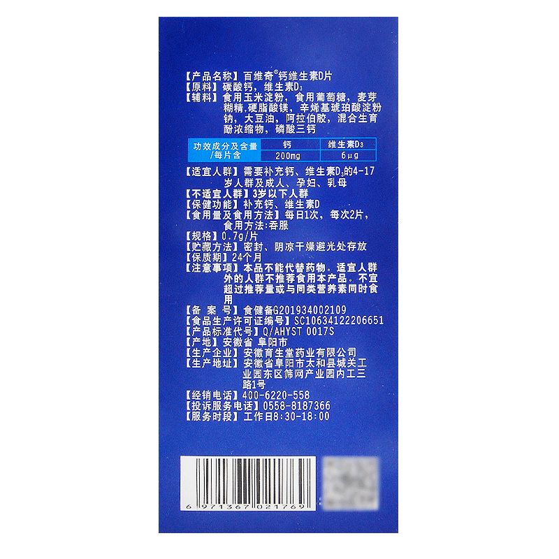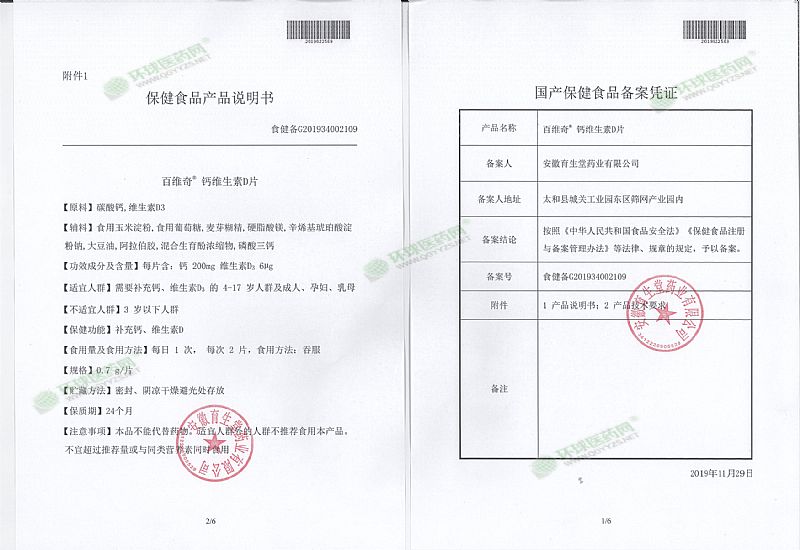 | 補(bǔ)充說明 | 申請人***稱:安徽育生堂藥業(yè)有限公司 功效成分/標(biāo)志性 成分含量:每片含:鈣200mg 維生素D3 6μg 不適宜人群:3歲以下人群 貯藏方法:密封、陰涼干燥避光處存放 主要原料:碳酸鈣,維生素D3 批準(zhǔn)文號:食健備G201934002109 產(chǎn)品標(biāo)準(zhǔn)號:SC10634122206651 廠名:安徽育生堂藥業(yè)有限公司 廠址:安徽省阜陽市太和縣城關(guān)工業(yè)園東區(qū)篩網(wǎng)產(chǎn)業(yè)園內(nèi) 保質(zhì)期:730天 產(chǎn)品名稱:百維奇?鈣維生素D 食用方法和食用量:每日1次,每次2片, 食用方法:吞服 注意事項(xiàng):本品不能代替藥物。適宜人群外的人群不推薦食用本產(chǎn)品。不宜超過推薦量或與同類營養(yǎng)素同時食用 |