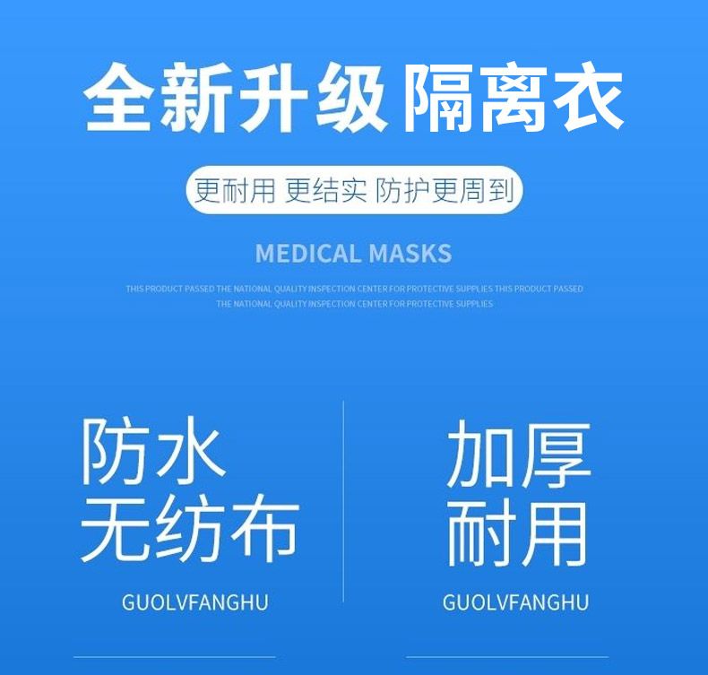 | 補(bǔ)充說明 | 隔離衣,SMMS四層防粘和熔噴復(fù)合無紡布面料,**無味,高效隔菌,拒水透氣,抗油污血漿,抗拉強(qiáng)度好,頭套和腳套全封閉,防護(hù)更**。 |