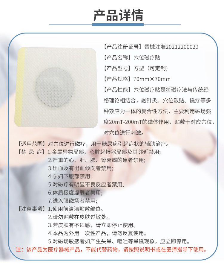 | 產(chǎn)品用途 | 【適用范圍】對(duì)穴位進(jìn)行磁療,用于糖尿病引起癥狀的輔助治療。 |