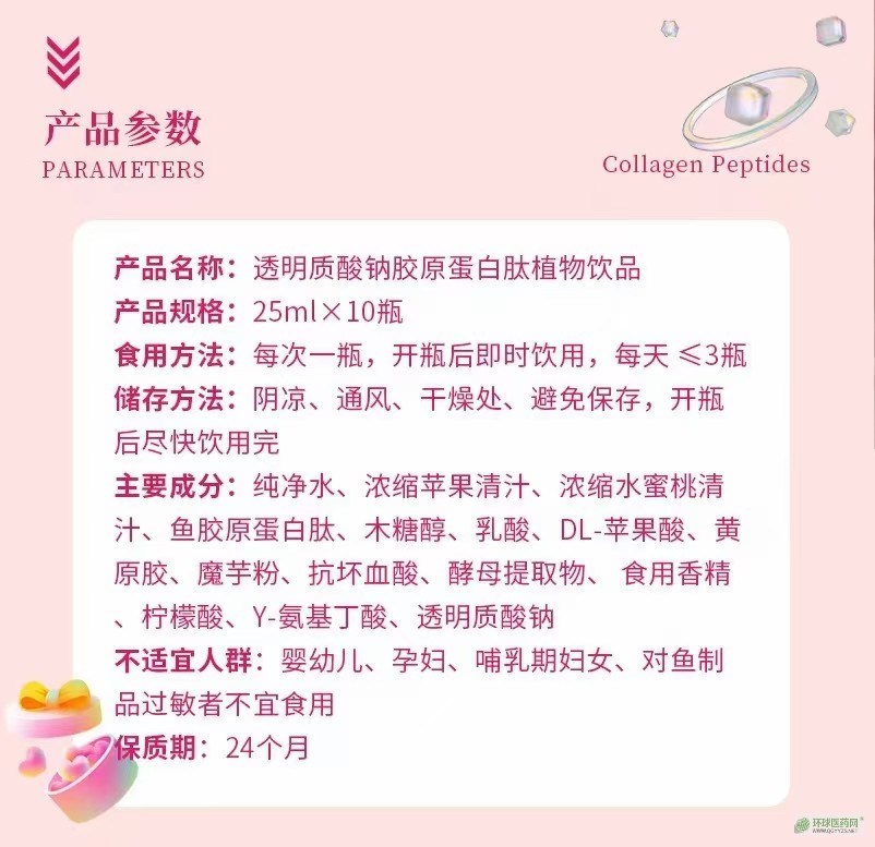 | 產(chǎn)品名稱 | 透明質(zhì)酸鈉膠原蛋白肽植物飲品 |