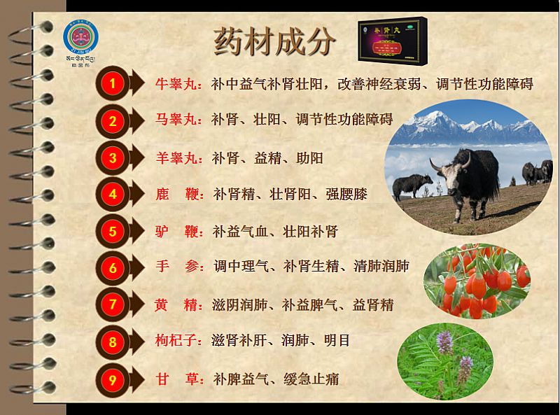 | 主要成分 | 牛睪丸、馬睪丸、羊睪丸、鹿鞭、驢鞭、手參、黃精、枸杞子、甘草。 |