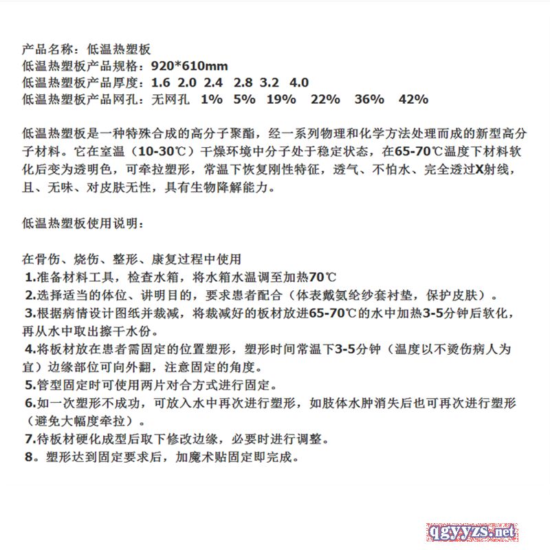 | 產(chǎn)品用途 | 低溫?zé)崴馨迨且环N特殊合成的高分子聚酯,經(jīng)一系列物理和化學(xué)方法處理而成的新型的醫(yī)用材料·用于骨科外固定、矯形器、支具的制作材料。由于該材料具有不吸收射線、加熱軟化后具有良好的塑型效果和所特有的形狀記憶功 |