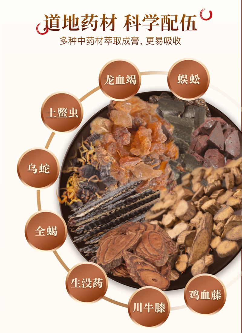 | 主要成分 | 本品是以龍血竭、烏蛇、細(xì)辛、蜈蚣、全蝎、土鱉蟲、肉桂、生乳香、生沒藥、牛角粉、樟腦、冰片、三七粉、威靈仙、七葉一枝花、桂枝、雞血藤、紅花、當(dāng)歸、川芎、生地、羌活、獨(dú)活、蓁艽、防風(fēng)、三棱、莪術(shù)、透骨草、木瓜、伸筋草、尋骨風(fēng)、干姜、急性子、川牛膝、九里香為主要原料,經(jīng)特定工藝加工而成。 |