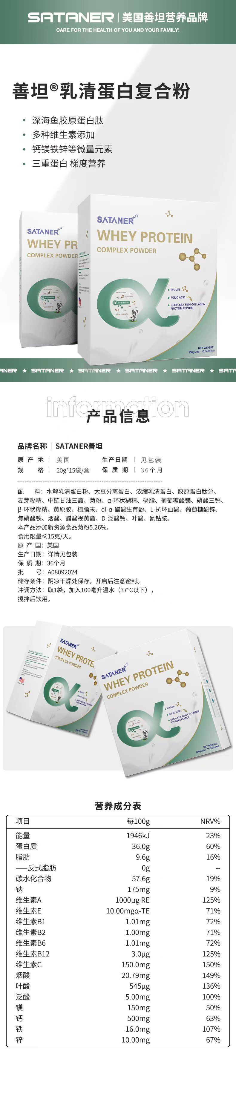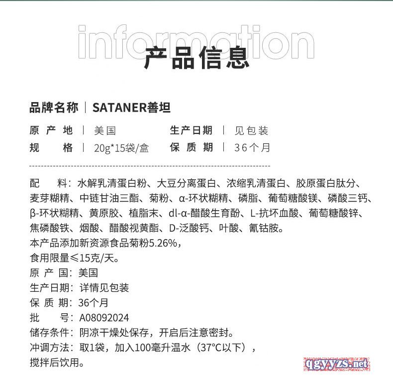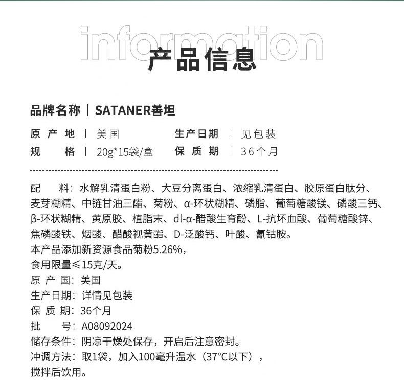 | 補(bǔ)充說明 | 產(chǎn)品信息 0n 品牌名稱 SATANER善坦 原產(chǎn)地|美國 生產(chǎn)日期|見包裝 規(guī) 格|20g*15袋/盒 保質(zhì)期136個月 配料:水解乳清蛋白粉、大豆分離蛋白、濃縮乳清蛋白、膠原蛋白肽分、麥芽糊精、中鏈甘油三酯、菊粉、a-環(huán)狀糊精、磷脂、葡萄糖酸鎂、磷酸三鈣、3-環(huán)狀糊精、黃原膠、植脂末、dl-a-醋酸生育酚、L-抗壞血酸、葡萄糖酸鋅、焦磷酸鐵、煙酸、醋酸視黃酯、D-泛酸鈣、葉酸、氰鈷胺。本產(chǎn)品添加新資源食品菊粉5.26%,食用限量≤15克/天。原產(chǎn)國:美國 生產(chǎn)日期:詳情見包裝保質(zhì)期:36個月批0OOO0707號:A08092024 儲存條件:陰涼干燥處保存,開啟后注意密封。 沖調(diào)方法:取1袋,加入100毫升溫水(37℃以下),攪拌后飲用。 SATANeR WHEY PROTE. COMHEK POWGEA 0gSATANER WHEY PROTEIN COMPLEX POWDER 營養(yǎng)成分表 項目 每100g NRV% 能量 1946kJ 23% 蛋白質(zhì) 36.0g 60% 脂肪 9.6g 16% -反式脂肪 0g 碳水化合物 57.6g 19% 鈉 175mg 9% 維生素A 1000μg RE 125% 維生素E 10.00mga-TE 71% 維生素B1 1.01mg 72% 維生素B2 1.00mg 71% 維生素B6 1.01mg 72% 維生素B12 3.0μg 125% 維生素C 150.0mg 150% 煙酸 20.79mg 149% 葉酸 545μg 136% 泛酸 5.00mg 100% 鎂 150mg 50% 500mg 63% 16.0mg 107% 鐵鋅 10.00mg 67% |