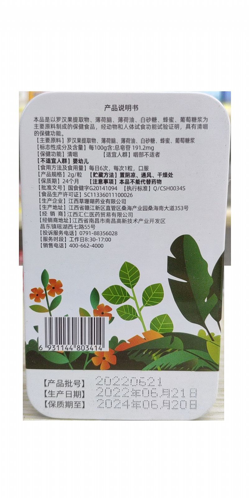 | 主要成分 | 羅漢果提取物、薄荷腦、薄荷油、白砂糖、蜂蜜、葡萄糖漿 |