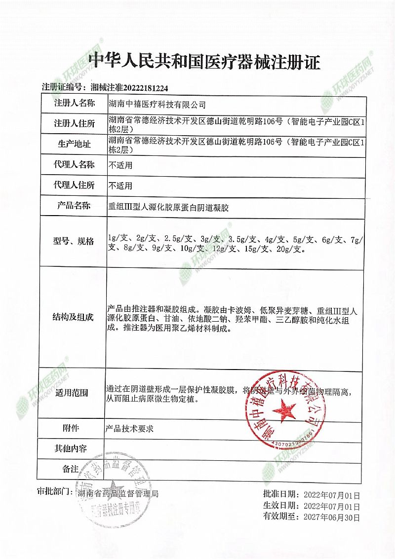 | 補(bǔ)充說明 | 重組III型人源化膠原蛋白陰道凝膠產(chǎn)品說明書 請(qǐng)仔細(xì)閱讀說明書并按說明使用或在醫(yī)師指導(dǎo)下使用 【產(chǎn)品名稱】重組III型人源化膠原蛋白陰道凝膠 【型號(hào)規(guī)格】1g/支、2g/支、2.5g/支、3g/支、3.5g/支、4g/支、5g/支、6g/支、7g/支、8g/支、9g/支、10g/支、12g/支、15g/支、20g/支。 【產(chǎn)品性能】推注器表面應(yīng)光滑,無鋒棱、無毛刺,外形應(yīng)無明顯變形。凝膠應(yīng)為無色至棕色,無肉眼可見異物、無雜質(zhì)。其他詳見產(chǎn)品技術(shù)要求。 【結(jié)構(gòu)及組成】產(chǎn)品由推注器和凝膠組成。凝膠由卡波姆、低聚異麥芽糖、重組Ⅲ型人源化膠原蛋白、甘油、依地酸二鈉、羥苯甲酯、三乙醇胺和純化水組成。推注器為醫(yī)用聚乙烯材料制成。 【作用機(jī)理】產(chǎn)品中低聚異麥芽糖具有雙歧桿菌增殖作用而調(diào)節(jié)陰道生態(tài)平衡;重組Ⅲ型人源化膠原蛋白具有保濕鎖水、修護(hù)肌膚和促進(jìn)細(xì)胞生長作用;甘油具有保濕潤燥作用;通過三乙醇胺堿中和后的卡波姆具有良好的成膜、粘附和凝膠基質(zhì)效應(yīng)起保護(hù)和鎖水修復(fù)作用;依地酸二鈉起螯合、穩(wěn)定、抗氧抗腐和維持酸堿平衡的作用。產(chǎn)品通過在宮頸和陰道壁形成一層保護(hù)性凝膠膜,將宮頸和陰道壁與外界細(xì)菌物理隔離,從而阻止病原微生物定植,降低病原微生物感染,從而達(dá)到預(yù)期用途。 【適用范圍】通過在陰道壁形成一層保護(hù)性凝膠膜。將陰道壁與外界細(xì)菌物理隔離,從而阻止病原微生物定植。 【使用方法】 1.打開包裝取下保護(hù)帽;2.將推注器輕輕插入陰道深處,利用助推桿將凝膠推入至宮頸處;3.每天1支。14天為一個(gè)療程。 【禁 忌 癥】經(jīng)期、孕期停用。處女和對(duì)本品過敏者禁用。 【注意事項(xiàng)、警示及提示性說明】 1.本品僅供外用,請(qǐng)勿內(nèi)服;廢棄物請(qǐng)按當(dāng)?shù)丨h(huán)保要求處理。 2.本產(chǎn)品為一次性使用,開封即用。使用前,請(qǐng)認(rèn)真閱讀說明書。 3.使用前清潔雙手和陰道,保持清潔衛(wèi)生。 4.請(qǐng)?jiān)诋a(chǎn)品有效期內(nèi)使用,包裝破損或性狀發(fā)生改變時(shí)禁止使用。 5.由于有少量流出物,建議與衛(wèi)生護(hù)墊合用;若有流出擦凈即可。 6.請(qǐng)將本品放在兒童不能接觸的地方。 7.本產(chǎn)品連續(xù)累計(jì)使用時(shí)間不超過24h。 【貯存條件】密封,在常溫處貯存。 【生產(chǎn)批號(hào)】、【生產(chǎn)日期】詳見產(chǎn)品包裝標(biāo)識(shí)。 【有效期限】 二年。 【醫(yī)療器械注冊(cè)證號(hào)】湘械注準(zhǔn)20222181224 【醫(yī)療器械生產(chǎn)企業(yè)許可證號(hào)】湘藥監(jiān)械生產(chǎn)許20220128號(hào) 【產(chǎn)品技術(shù)要求編號(hào)】湘械注準(zhǔn)20222181224 【注冊(cè)人/生產(chǎn)企業(yè)名稱】 湖南中禧醫(yī)療科技有限公司 【售后服務(wù)單位】 湖南中禧醫(yī)療科技有限公司 【注冊(cè)人住所/生產(chǎn)地址】 湖南省常德經(jīng)濟(jì)技術(shù)開發(fā)區(qū)德山街道乾明路106號(hào)(智能電子產(chǎn)業(yè)園C區(qū)1棟2層) 【郵政編碼】415001 【聯(lián)系方式】 電話號(hào)碼:400-0816885 【說明書編制/修改日期】2022年05月16日編制 版本號(hào)A/1。 |