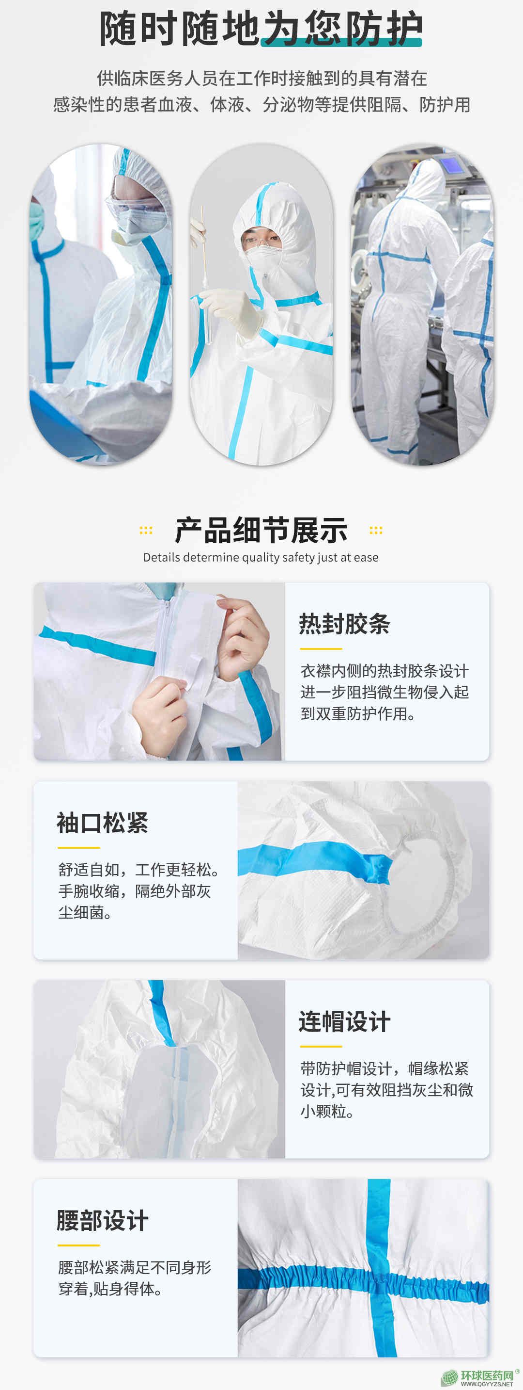 | 產(chǎn)品賣點(diǎn) | 連體防護(hù)服獨(dú)立包裝,帶帽連體衣、防液體飛沫、醫(yī)用滅菌、透氣防水。 |