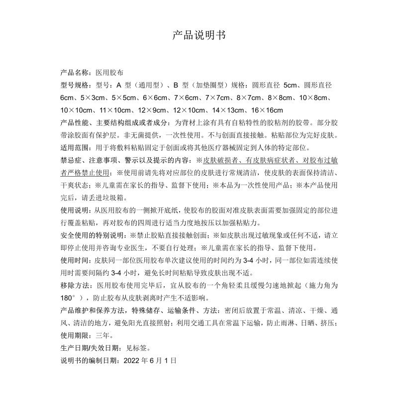 | 補充說明 | 產(chǎn)品說明書 【產(chǎn)品名稱】醫(yī)用膠布 【型號規(guī)格】型號:A 型(通用型)、B 型(加墊圈型)規(guī)格:圓形直徑 5cm、圓形直徑 6cm、5×3cm、5×5cm、6×6cm、7×6cm、7×7cm、8×7cm、8×8cm、10×8cm、10×10cm、11×10cm、12×9cm、12×10cm、14×13cm、16×16cm 【產(chǎn)品性能、主要結(jié)構(gòu)組成或者成分】為背材上涂有具有自粘特性的膠粘劑的膠帶。部分膠帶涂膠面有保護層。非無菌提供,一次性使用。不與創(chuàng)面直接接觸。粘貼部位為完好皮膚。[印康牌] 【適用范圍】用于將敷料粘貼固定于創(chuàng)面或?qū)⑵渌t(yī)療器械固定到人體的特定部位。 【禁忌癥、注意事項、警示以及提示的內(nèi)容】※皮膚破損者、有皮膚病癥狀者、對膠布過敏者嚴格禁止使用;※使用前請先將對應(yīng)部位的皮膚進行常規(guī)清潔,使皮膚的表面保持清潔、干爽狀態(tài);※兒童需在家長的指導(dǎo)、監(jiān)督下使用;※本品為一次性使用產(chǎn)品;※本產(chǎn)品使用完后,請丟進垃圾箱。 【使用說明】從醫(yī)用膠布的一側(cè)掀開底紙,使膠布的膠面對準皮膚表面需要加強固定的部位進行覆蓋粘貼,再對膠布的四周進行適當力度地按壓以加強粘貼力。[印康牌] 【使用期限】三年。 【生產(chǎn)日期/失效日期】見標簽。 【說明書的編制日期】2022年6月1日 【品牌名稱】印康 |
