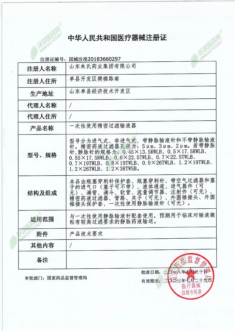 | 其它說明 | 山東朱氏藥業(yè)集團一次性使用精密過濾輸液器(避光性,高透性),一次性使用靜脈留置針,一次性使用無菌注射器,一次性使用配藥用注射器,醫(yī)用超聲耦合劑,一次性使用真空采血管,一次性使用胃管,一次性使用醫(yī)用導(dǎo)尿包無菌雙腔硅膠尿管成人男女等醫(yī)療器械,資質(zhì)齊全,多個省區(qū)中標(biāo),歡迎來電咨詢 |