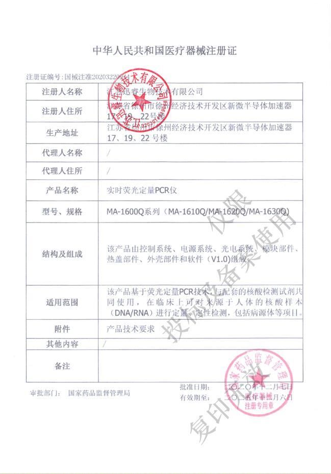 | 補(bǔ)充說明 | 注冊證號 國械注準(zhǔn)20203220944 適用范圍 該產(chǎn)品基于熒光定量PCR技術(shù),與配套的核酸檢測試劑共同使用,在臨床上可對來源于人體的核酸樣本(DNA/RNA)進(jìn)行定量、定性檢測,包括病源體等項目。 結(jié)構(gòu)及組成 型號MA-1610Q、型號MA-1620Q和型號MA-1630Q由控制系統(tǒng)、電源系統(tǒng)、光電系統(tǒng)、模塊部件、熱蓋部件、外殼部件和軟件(版本號:V1.0)組成;型號MA-1640Q由控制系統(tǒng)、電源系統(tǒng)、光電系統(tǒng)、模塊部件、熱蓋部件、外殼部件、軟件V1.0和PC端軟件(版本號V1.0)組成 注冊信息 |