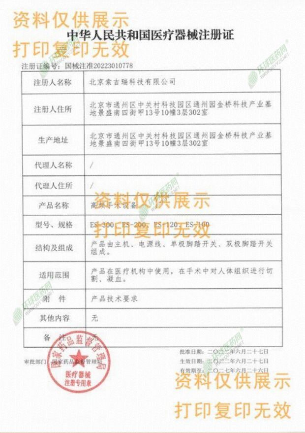 | 英文名稱 | Suojirui high frequency surgical equipment ES-100 |