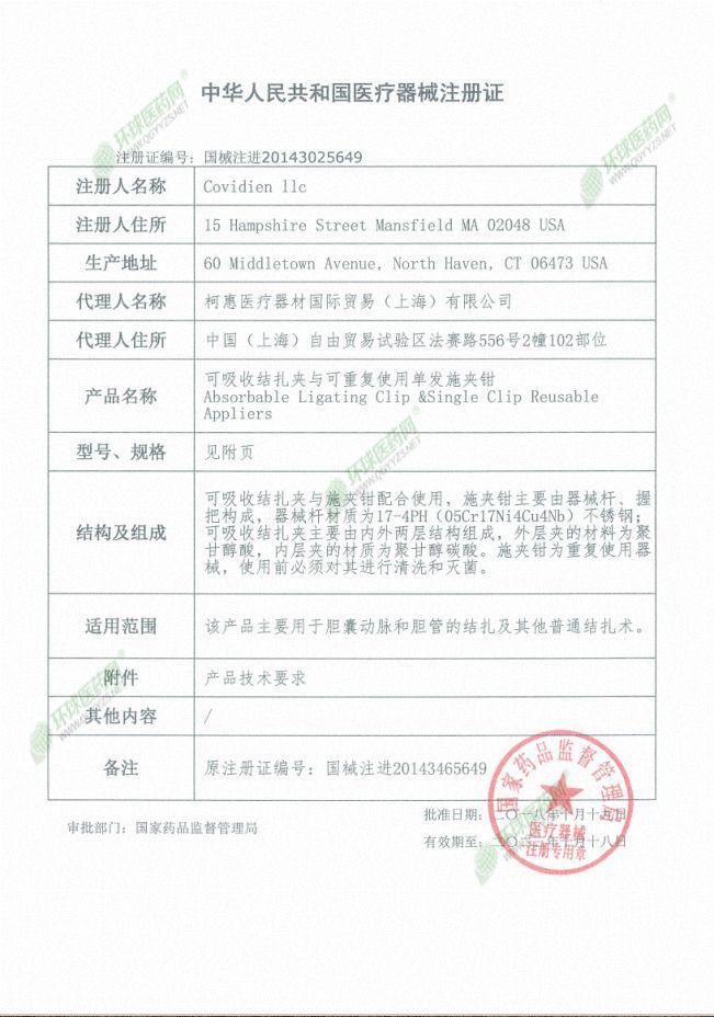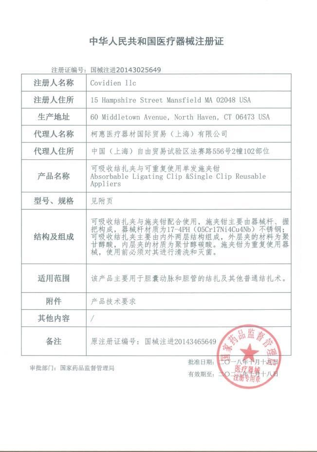 生產(chǎn)企業(yè): 柯惠醫(yī)療器材國(guó)際貿(mào)易(上海)有限公司