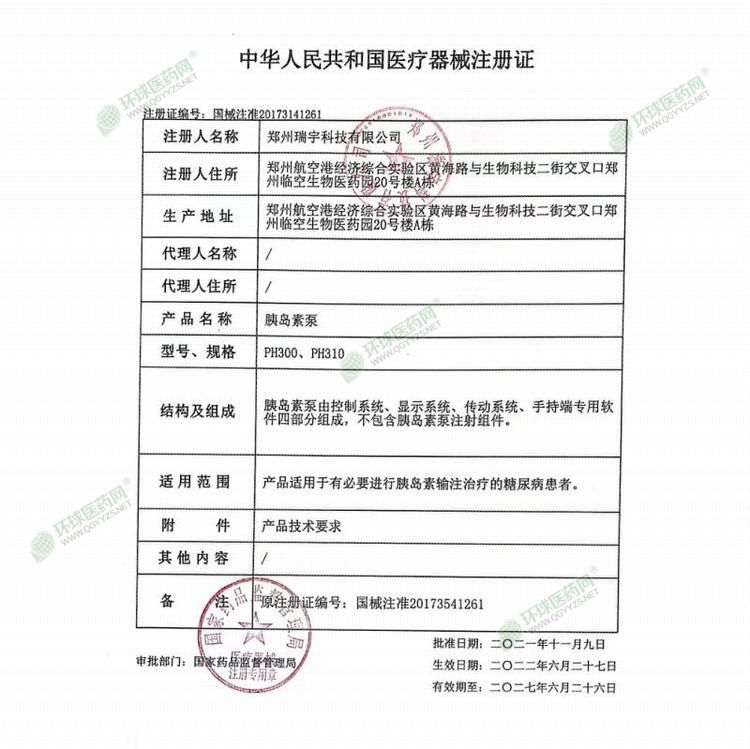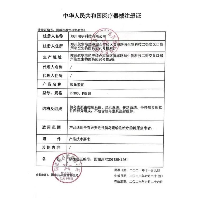 | 補(bǔ)充說明 | 注冊(cè)證號(hào) 國械注準(zhǔn)20173141261 適用范圍 產(chǎn)品適用于有必要進(jìn)行胰島素輸注治療的糖尿病患者。 結(jié)構(gòu)及組成 胰島素泵由控制系統(tǒng)、顯示系統(tǒng)、傳動(dòng)系統(tǒng)、手持端專用軟件四部分組成,不包含胰島素泵注射組件。 注冊(cè)信息 |