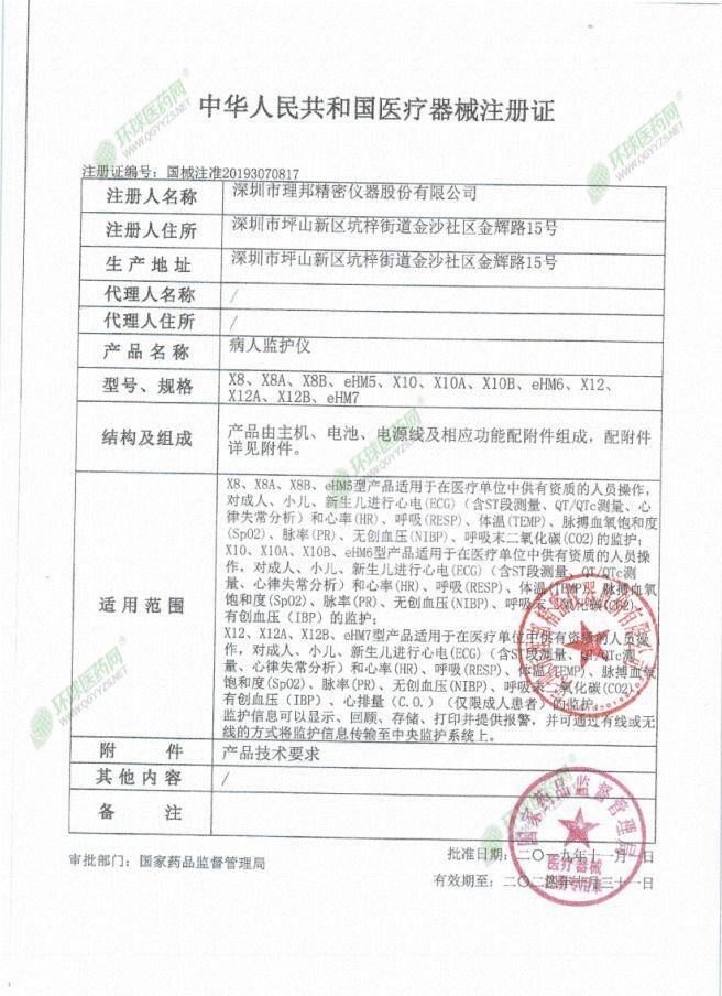 | 補(bǔ)充說(shuō)明 | 注冊(cè)證號(hào) 粵械注準(zhǔn)20152070788 適用范圍 適用于醫(yī)療單位對(duì)患者進(jìn)行心電、心率、無(wú)創(chuàng)血壓、脈搏氧飽和度、呼吸、體溫、脈率和呼吸末二氧化碳的監(jiān)測(cè) 結(jié)構(gòu)及組成 由主機(jī)和相應(yīng)功能附件(心電電纜、無(wú)創(chuàng)血壓袖帶、血氧傳感器、體溫傳感器、二氧化碳?xì)怏w測(cè)量組件)組成。其中二氧化碳?xì)怏w測(cè)量組件可選配EDAN(理邦)G2型或者Respir0nics(偉康)C5型模塊;無(wú)創(chuàng)血壓測(cè)量組件可選配EDAN(理邦)或者Omr0n(歐姆龍)模塊;脈搏氧飽和度測(cè)量組件可選配EDAN(理邦)或者Nellcor模塊 注冊(cè)信息 |