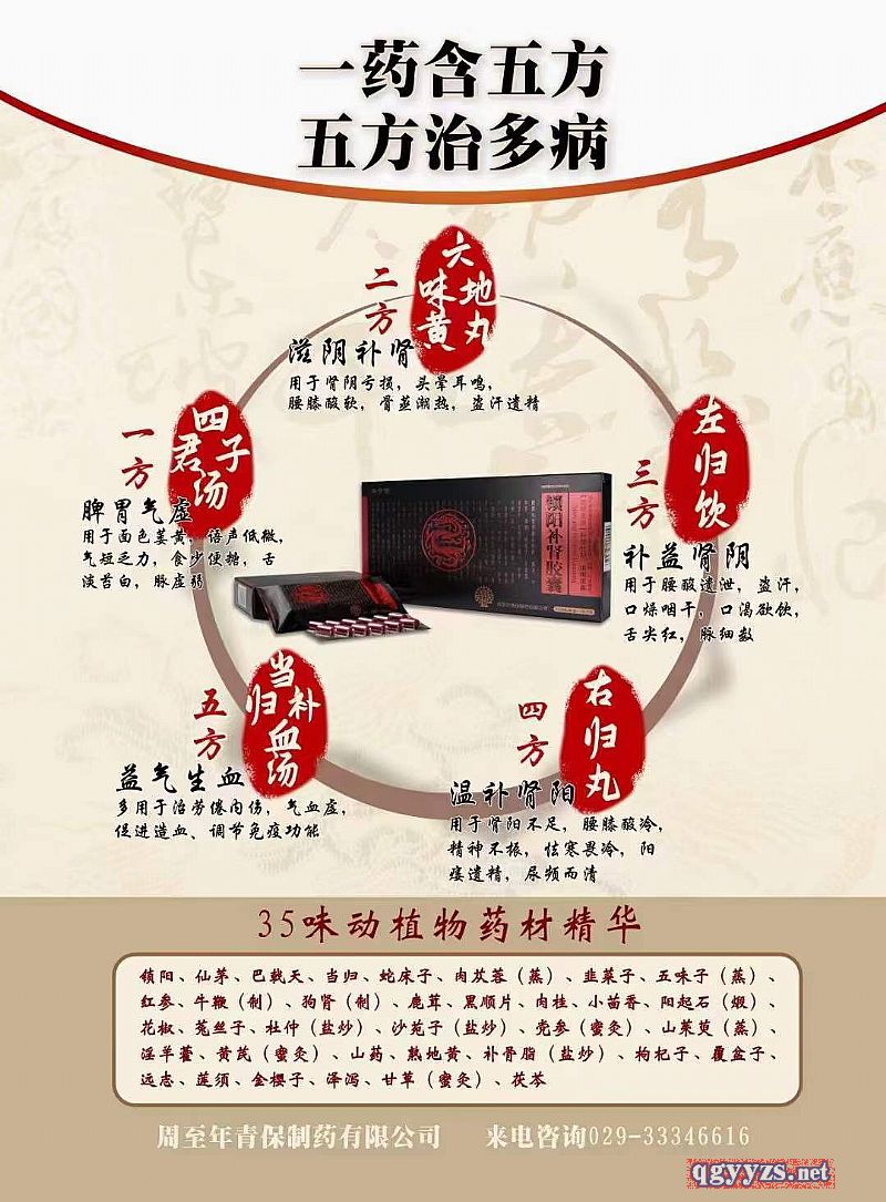 | 主要成分 | 鎖陽(yáng)、仙茅、巴戟天、當(dāng)歸、蛇床子、肉蓯蓉、韭菜子、五味子、紅參、牛鞭、狗腎、鹿茸、黑順片、肉桂、小茴香、陽(yáng)起石、花椒、菟絲子、杜仲、沙苑子、黨參、山茱萸、淫羊藿、黃芪、山藥、熟地黃、補(bǔ)骨脂、枸杞子、覆盆子、遠(yuǎn)志、蓮須、 |