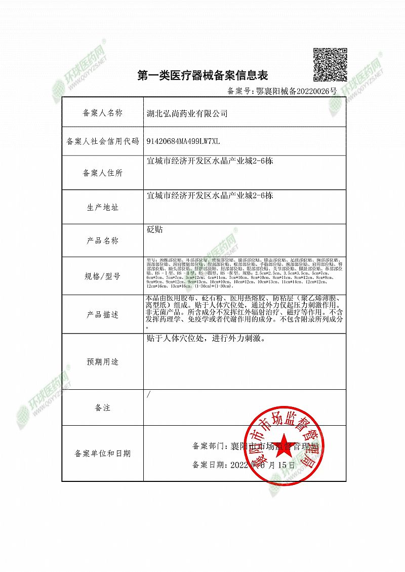 | 主要成分 | 本品由醫(yī)用膠布、砭石粉、醫(yī)用熱熔膠、防粘層(聚乙烯薄膜、離型紙)組成。貼于人體穴位處,通過外力僅起壓力刺激作用。非無菌產(chǎn)品。所含成分不發(fā)揮紅外輻射治療、磁療等作用。不含發(fā)揮藥理學(xué)、免疫學(xué)或者代謝作用的成分。不包含附錄所列成分。 |