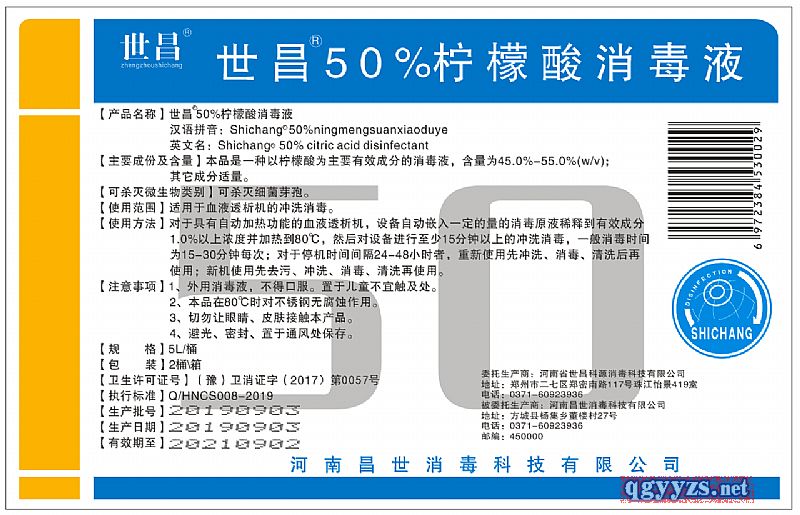 產(chǎn)品名稱: 世昌®;50%檸檬酸消毒液