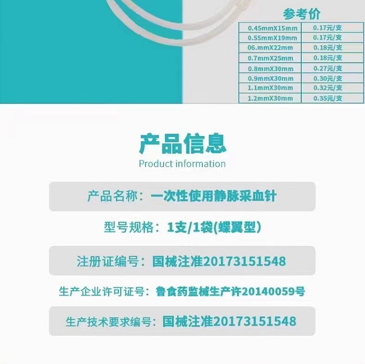 | 補(bǔ)充說(shuō)明 | 適用科室:檢驗(yàn)科、體檢中心、疾控中心、血站等。 型號(hào)規(guī)格:蝶翼型0.7×25mm,6盒/件 結(jié)構(gòu)組成:產(chǎn)品由靜脈采血針、靜脈采血針護(hù)套、針柄、導(dǎo)管、連接座、管塞穿刺針及管塞穿刺針護(hù)套組成。 使用說(shuō)明: 1.系好壓脈帶,消毒穿刺部位,打開(kāi)采血針的小包裝,拔除針尖護(hù)套淮備穿刺。 2.待消毒溶液干燥后,握持針柄進(jìn)行靜脈穿刺:(如為活動(dòng)連接采血針,應(yīng)先擰緊連接錐頭)。 3.見(jiàn)回血后,將采血針之管塞穿刺針刺透采血管膠塞進(jìn)行采血。 4.采血至額定采血量時(shí)拔出管塞穿刺針,(多管采集時(shí))更換其它采血管并重復(fù)步驟3 (該步驟至多重復(fù)4次)。 5.采血完畢,先拔靜脈穿刺針后拔采血管。 注意事項(xiàng): 1、包裝破損或保護(hù)套脫落,針尖異常,禁止使用。 2、護(hù)套為防止血液泄漏,使用時(shí)禁止取下。 3、本品經(jīng)環(huán)氧乙烷滅菌。 4、本產(chǎn)品導(dǎo)管含DEHP增塑劑。 5、只限一次性使用,用后銷(xiāo)毀。 使用期限:三年 貯藏、運(yùn)輸環(huán)境及方法:包裝后的一次性使用靜脈采血針應(yīng)防止重壓、陽(yáng)光直曬和雨水浸淋;貯存在陰涼干燥,無(wú)腐蝕性氣體、通風(fēng)良好的清潔室內(nèi)。 |
