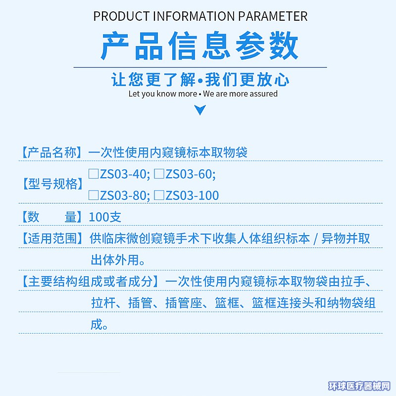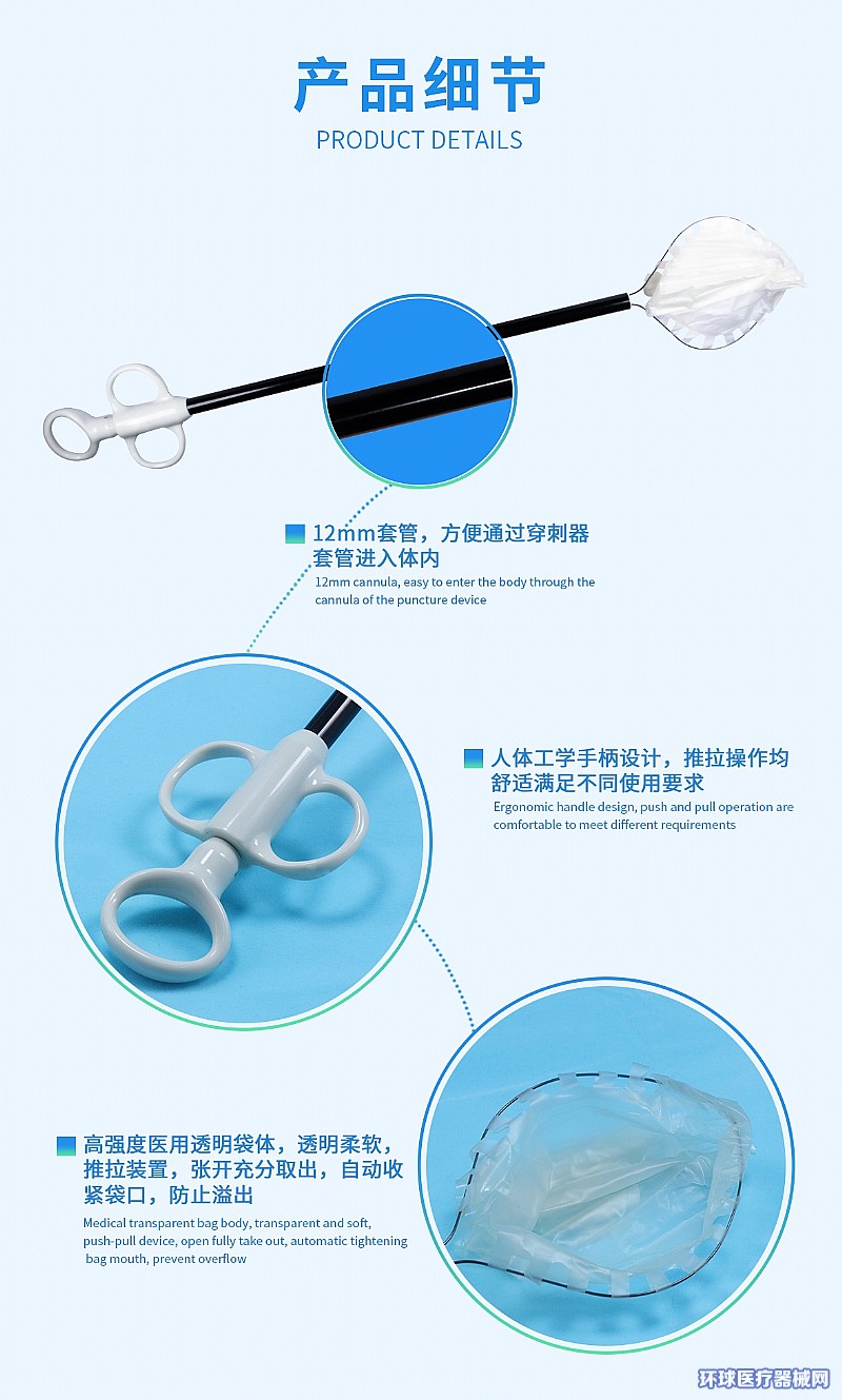 | 產(chǎn)品用途 | 供臨床微創(chuàng)窺鏡手術(shù)下收集人體組織標(biāo)本/異物并取出體外用。 |