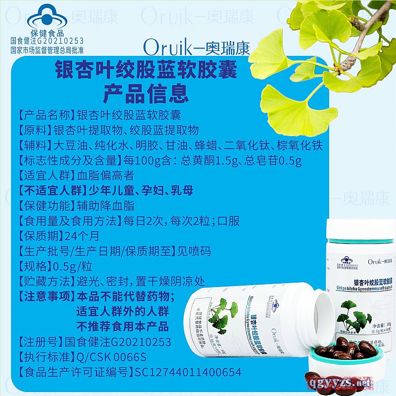 | 補(bǔ)充說明 | 產(chǎn)品基本信息: 【產(chǎn)品名稱】銀杏葉絞股藍(lán)軟膠囊 【原料】銀杏葉提取物、絞股藍(lán)提取物 【輔料】大豆油、純化水、明膠、甘油、蜂蠟、二氧化鈦、棕氧化鐵 【標(biāo)志性成分及含量】每100g含:總黃酮1.5g、總皂苷0.5g 【適宜人群】血脂偏高者 【不適宜人群】少年兒童、孕婦、乳母 【保健功能】輔助降血脂 【食用量及食用方法】每日2次,每次2粒;口服 【保質(zhì)期】24個(gè)月 【生產(chǎn)批號/生產(chǎn)日期/保質(zhì)期至】見噴碼 【規(guī)格】0.5g/粒 【貯藏方法】避光、密封,置干燥陰涼處 【注意事項(xiàng)】本品不能代替藥物;適宜人群外的人群不推薦食用本產(chǎn)品 【注冊號】國食健注G20210253 【執(zhí)行標(biāo)準(zhǔn)】Q/CSK 0066S 【食品生產(chǎn)許可證編號】SC12744011400654 |