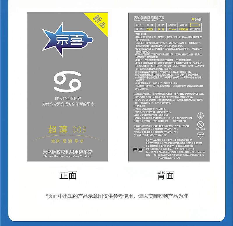 補(bǔ)充說(shuō)明 京喜超薄003星座系列男用避孕套是由京喜科技公司,經(jīng)過(guò)大量的市場(chǎng)調(diào)研精心研發(fā)的一款將避孕套與星座文化緊密而有趣結(jié)合的產(chǎn)品。通過(guò)相關(guān)領(lǐng)域?qū)Σ煌亲膶傩蕴攸c(diǎn)的分析,創(chuàng)造性的設(shè)計(jì)出適合星座的避孕套。不僅能夠讓使用者的安心,還能夠帶來(lái)娛樂(lè)性的體驗(yàn)。這也充分體現(xiàn)了京喜公司的專(zhuān)業(yè)和誠(chéng)意。在產(chǎn)品同質(zhì)化非常嚴(yán)重的今天可以說(shuō)是避孕套行業(yè)的一大亮點(diǎn)。
