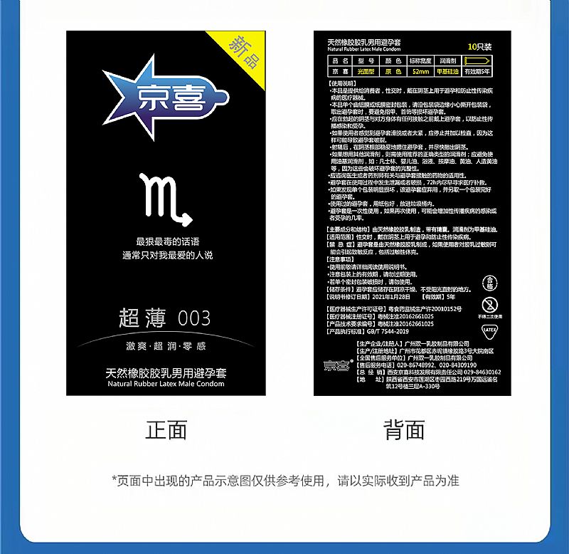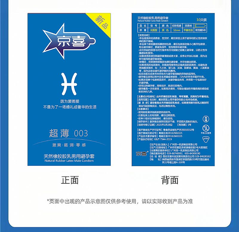其它說(shuō)明 西安京喜科技發(fā)展有限責(zé)任公司,2012年9月成立于古城西安,是一家專(zhuān)注于兩性健康的企業(yè)。公司主打創(chuàng)新品牌"京喜"“京喜星座”等計(jì)生用品品牌。京喜星座避孕套是一款避孕套與星座文化,娛樂(lè)文化有趣結(jié)合的產(chǎn)品。通過(guò)對(duì)不同星座的屬性性格印象分析,設(shè)計(jì)出適合星座特點(diǎn)的避孕套。不僅能夠讓使用者的安心,還能夠帶來(lái)娛樂(lè)性的體驗(yàn),我們的本質(zhì)在于追求快樂(lè)、持續(xù)創(chuàng)造驚喜,運(yùn)用科學(xué)新技術(shù),同“Z時(shí)代”年輕時(shí)尚群體一同進(jìn)步。