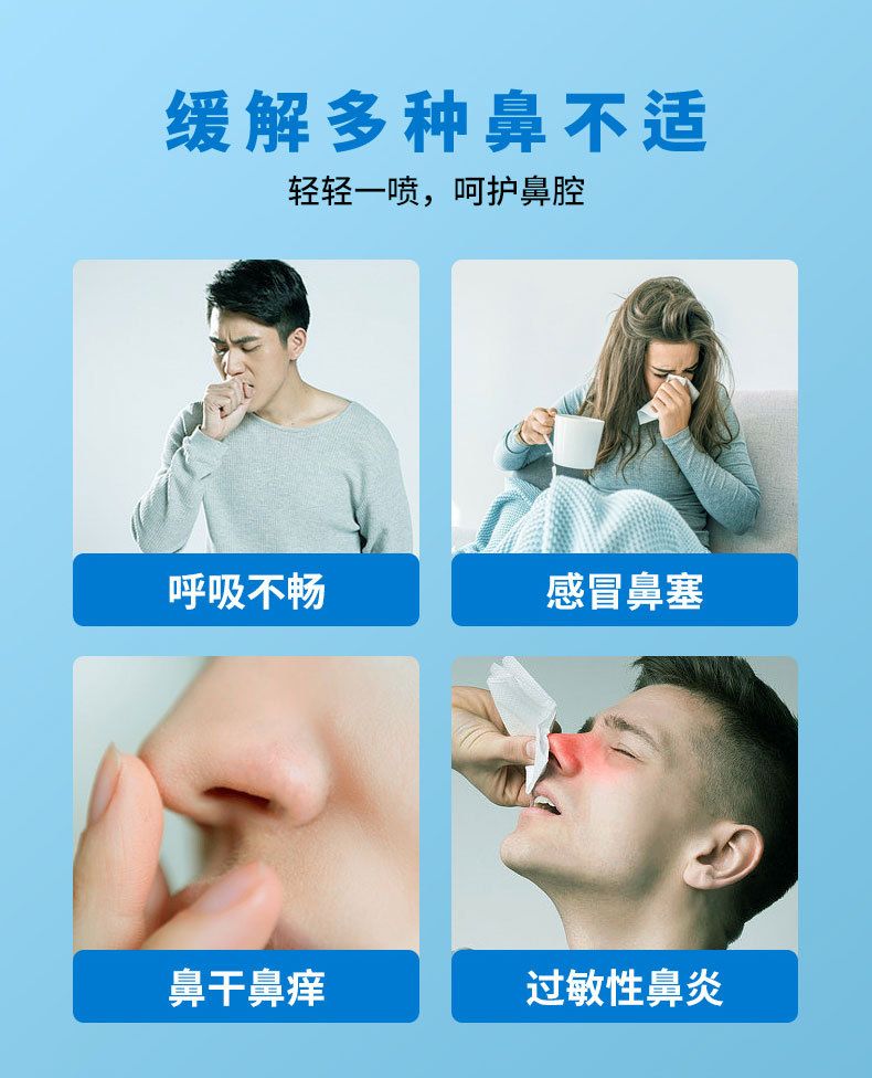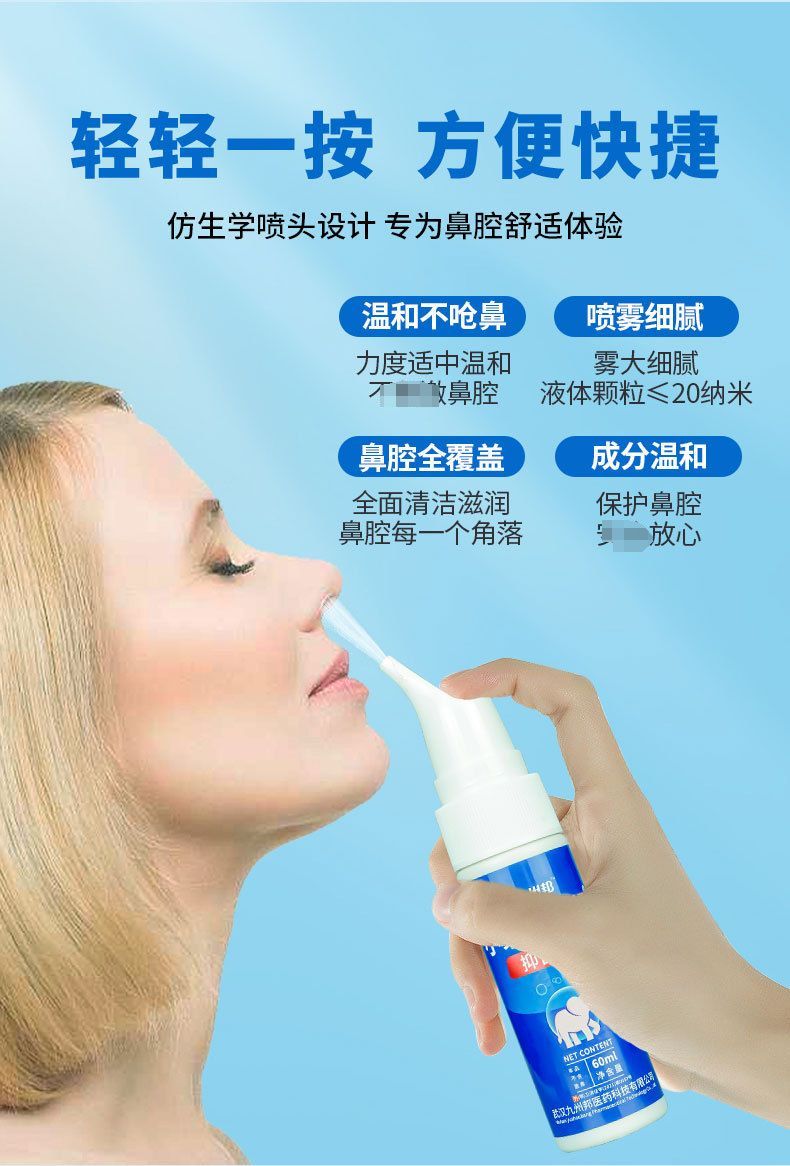 | 使用方法 | 1.開啟防塵罩,頭稍往后仰,將噴嘴貼近鼻孔,輕按手動(dòng)泵,使海水呈霧狀噴入鼻腔; 2.每日3-6次,每次每鼻孔4-8噴; 3.清洗后,停頓幾秒鐘,用紙巾擦凈鼻周; 4.清潔噴嘴,蓋上防塵罩。 |