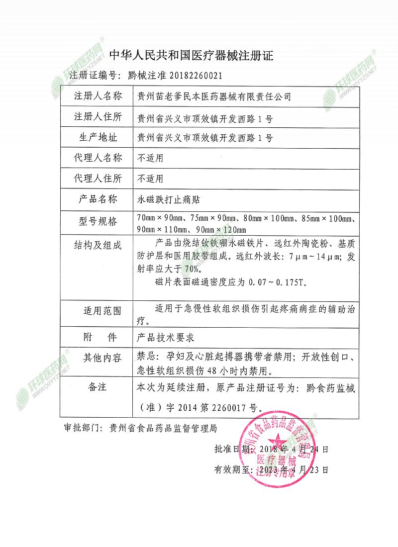 | 補充說明 | 1、使用本品,若個別皮膚出現(xiàn)瘙癢或皮疹,應(yīng)立即停止使用即可。 2、使用或存放本品時應(yīng)遠(yuǎn)離磁卡和易受磁損壞物品;不要與帶金屬儀表的器械同時使用。 3、開放性傷口、孕婦、兒童、心臟起搏器攜帶者和對磁療有明顯不良反應(yīng)者禁用。 4、置于干燥通風(fēng)處保存。 【售后服務(wù)單位】貴州苗老爹民本醫(yī)藥器械有限責(zé)任公司 【注冊人住所】貴州省興義市頂效鎮(zhèn)開發(fā)西路1號 |