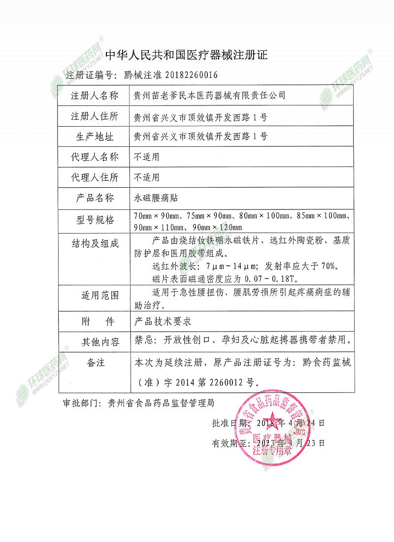 | 補充說明 | 1、使用本品,若個別皮膚出現(xiàn)瘙癢或皮疹,應立即停止使用即可。 2、使用或存放本品時應遠離磁卡和易受磁損壞物品;不要與帶金屬儀表的器械同時使用。 3、開放性傷口、孕婦、兒童、心臟起搏器攜帶者和對磁療有明顯不良反應者禁用。 4、置于干燥通風處保存。 【售后服務單位】貴州苗老爹民本醫(yī)藥器械有限責任公司 【注冊人住所】貴州省興義市頂效鎮(zhèn)開發(fā)西路1號 |