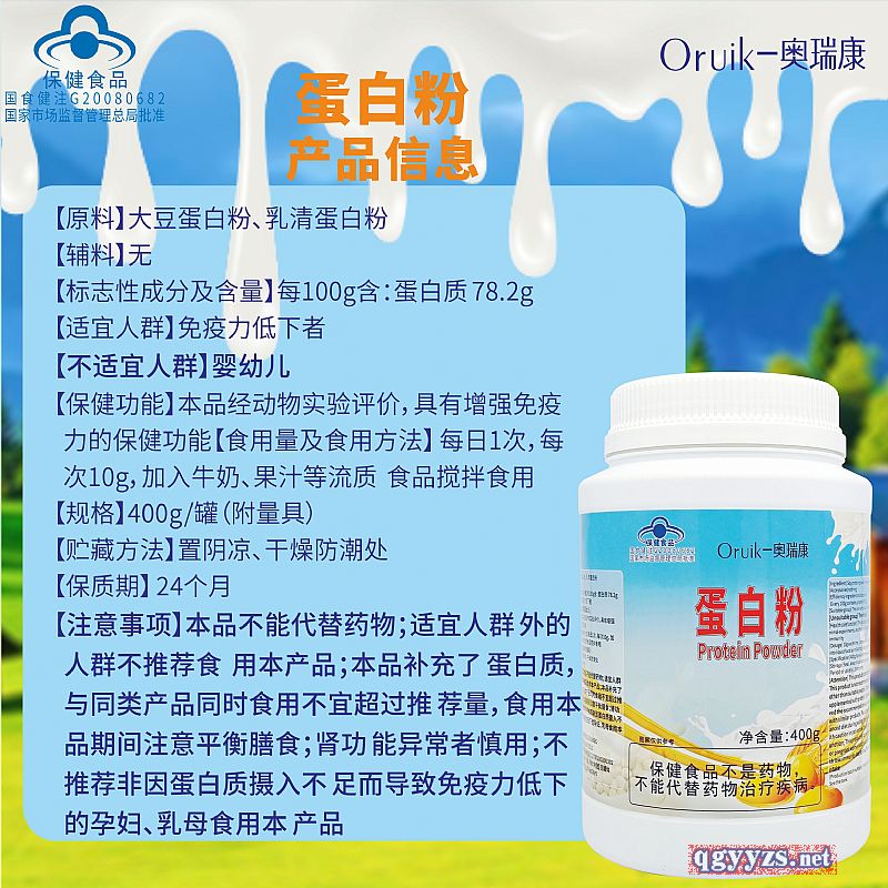 | 補充說明 | 【原料】大豆蛋白粉、乳清蛋白粉 【輔料】無 【標(biāo)志性成分及含量】每100g含:蛋白質(zhì) 78.2g 【適宜人群】免疫力低下者 【不適宜人群】嬰幼兒 【保健功能】本品經(jīng)動物實驗評價,具有增強免疫力的保健功能 【食用量及食用方法】 每日1次,每次10g,加入牛奶、果汁等流質(zhì)食品攪拌食用 【規(guī)格】400g/罐(附量具) 【貯藏方法】置陰涼、干燥防潮處 【保質(zhì)期】 24個月 【注意事項】本品不能代替藥物;適宜人群外的人群不推薦食用本產(chǎn)品;本品補充了蛋白質(zhì),與同類產(chǎn)品同時食用不宜超過推薦量,食用本品期間注意平衡膳食;腎功 能異常者慎用;不推薦非因蛋白質(zhì)攝入不足而導(dǎo)致免疫力低下的孕婦、乳母食用本產(chǎn)品 |