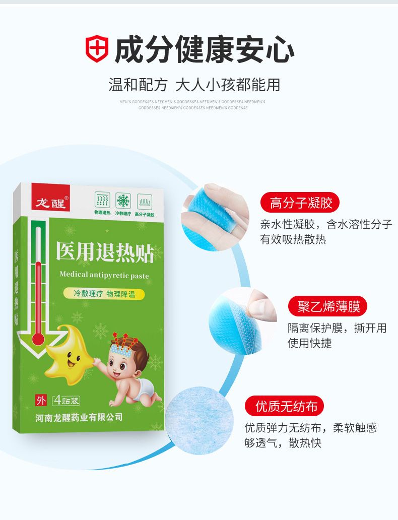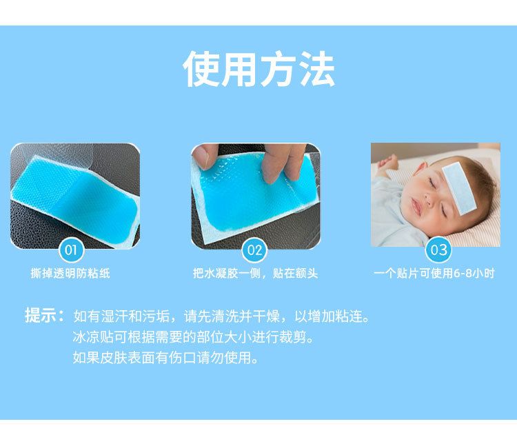 | 使用方法 | 外用,用酒精或溫水將體表面特定部位(額頭等)清潔擦干后,取出貼劑,去除保護(hù)膜層,將膠面貼敷于特定部位(額頭等),輕輕按壓即可,每6-12小時更換一次,或遵醫(yī)囑。 |