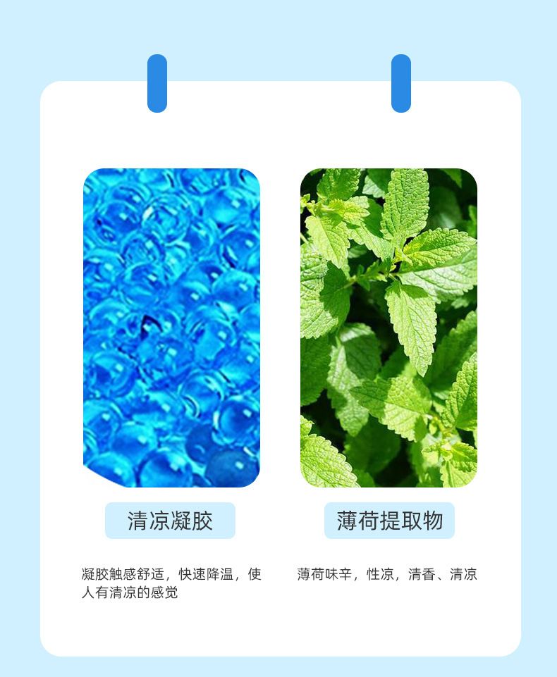 | 主要成分 | 由水、甘油、聚丙烯酸鈉、甘氨酸鋁、乙二胺四乙酸二鈉、酒石酸,DMDM乙內(nèi)酰脲、亮藍(lán)和各種形式的無(wú)紡布背襯層、凝膠層、聚乙烯薄膜覆蓋層組成。降溫物質(zhì)不含有發(fā)揮藥理學(xué)、免疫學(xué)或者代謝作用的成分,不包含附錄所列成分。非無(wú)菌產(chǎn)品。 |