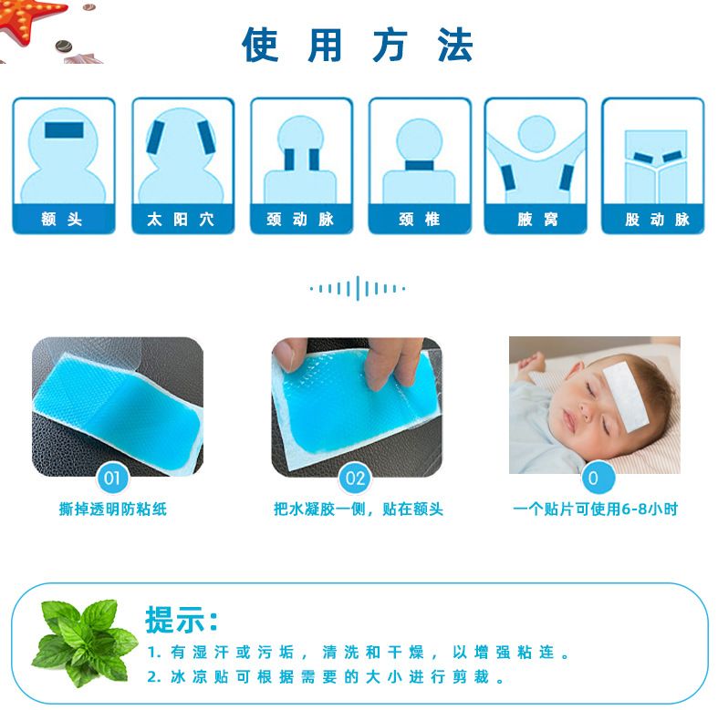 | 使用方法 | 外用,用酒精或溫水將體表面特定部位(額頭等)清潔擦干后,取出貼劑,去除保護膜層,將膠面貼敷于特定部位(額頭等),輕輕按壓即可,每6-12小時更換一次,或遵醫(yī)囑。 |