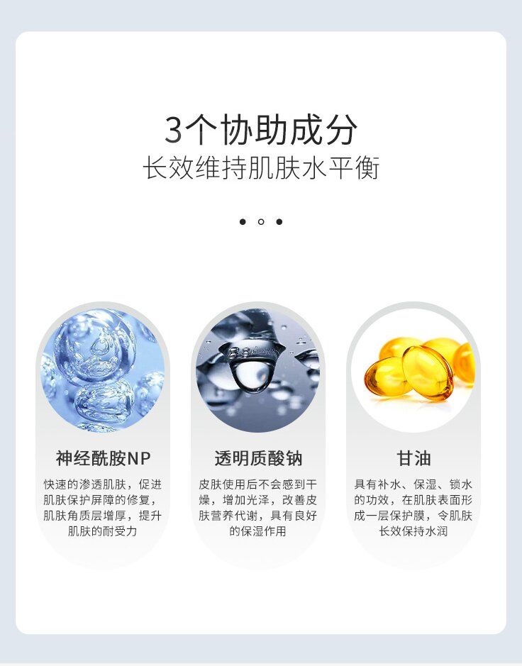 | 主要成分 | 煙酰胺、透明質(zhì)酸鈉、神經(jīng)酰胺NP、凝血酸、甘油、對羥基苯乙酮、丙二醇 |