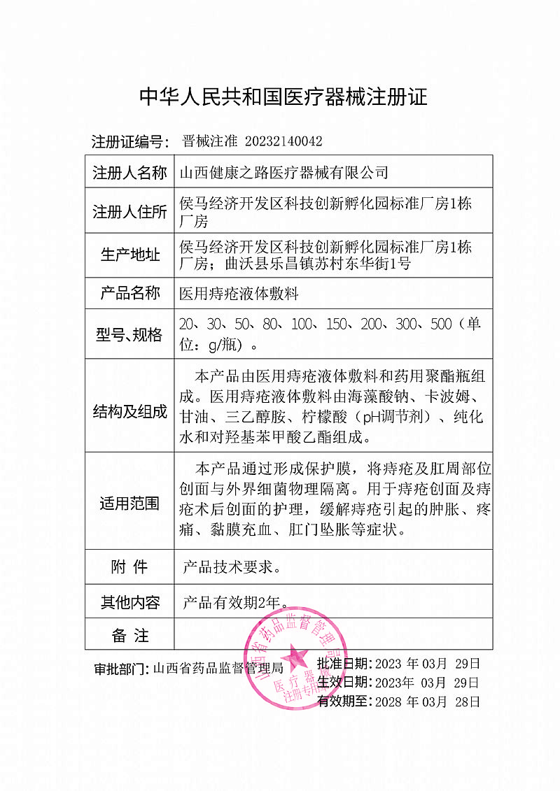 | 補充說明 | 【使用方法】 本品為外用品,直接沖洗肛周;驅a品注入沖洗器(建議使用者自行采購一次性沖洗器),沖洗器頭部插入肛門,進行擠壓沖洗。 【禁忌癥】 對本品過敏者禁止使用,過敏體質者慎用。 【注意事項】 1.本品為外用品,禁止口服; 2.使用后請洗手,切勿接觸眼睛、口腔等黏膜處; 3.忌煙酒及辛辣、油膩、刺激性食物; 4.兒童須在成人監(jiān)護下使用; 5.請妥善放置本產品,將本品放置在兒童不能接觸的位置; 6.內痔出血過多或原因不明的便血應去醫(yī)院就診; 7.本品包裝破損、性狀發(fā)生改變時禁止使用; 8.如正在使用其他藥品,使用本品前請咨詢醫(yī)師或藥師; 9.如果不慎入眼,請用大量清水沖洗或及時就醫(yī); 10.使用前請閱讀說明書,在產品有效期內使用,超過有效期禁止使用。 【貯存】應貯存在通風干燥處,無腐蝕性氣體和通風良好的室內。 【運輸】產品在運輸過程中應避免日曬、雨淋及重壓。 【配件清單】醫(yī)用痔瘡液體敷料、說明書。 【有 效 期】二年 【生產日期/生產批號】見外包裝 【醫(yī)療器械生產許可證編號】晉藥監(jiān)械生產許20200012號 【醫(yī)療器械注冊證編號】晉械注準20232140042 【醫(yī)療器械產品技術要求編號】晉械注準20232140042 【注冊人名稱/生產企業(yè)/售后服務單位】山西健康之路醫(yī)療器械有限公司 |