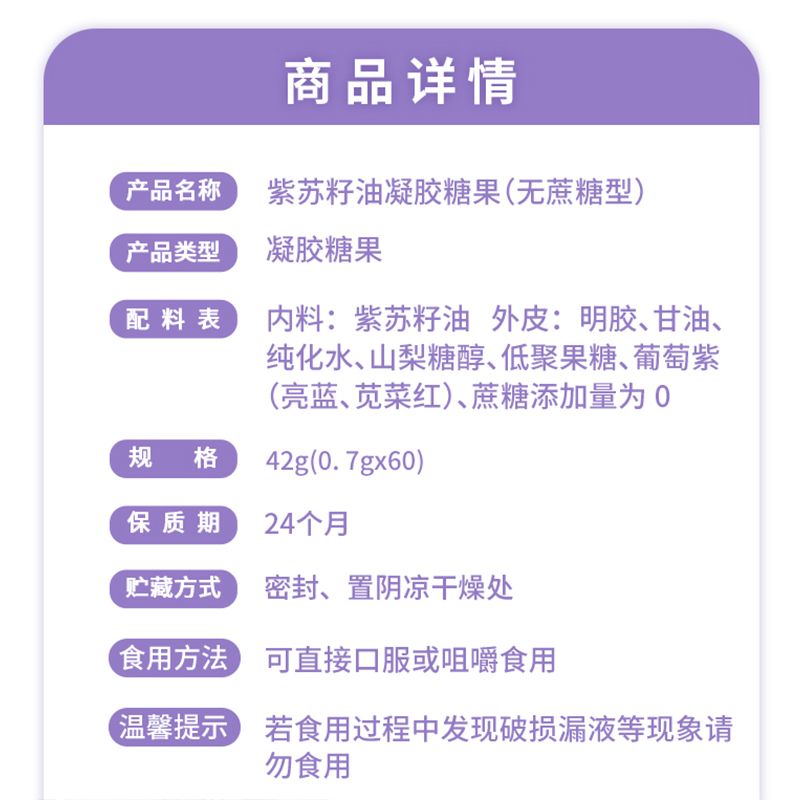 | 主要成分 | 紫蘇籽油外皮:明膠、甘油、純化水、山梨糖醇、低聚果糖、葡萄紫(亮藍、莧菜紅)、蔗糖添加量為0 |