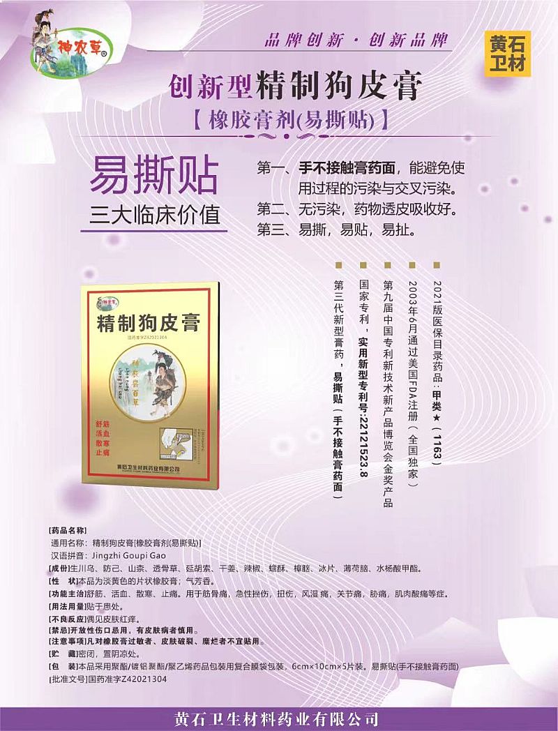 | 產(chǎn)品賣點(diǎn) | 三大臨床價(jià)值: 1.手不接觸膏藥面,能避免使用過程的污染和交叉污染。 2.膏藥面無污染,藥物透皮吸收好。 3.易撕、易貼、易扯。 |