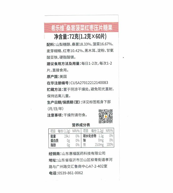 | 主要成分 | 山梨糖醇桑葚18.33%菠菜16.67% 麥芽糊精、紅棗10.42%黑木耳、淀粉、甘氨酸亞鐵、硬脂酸鎂。 |