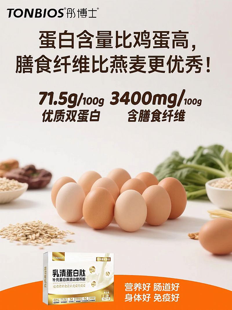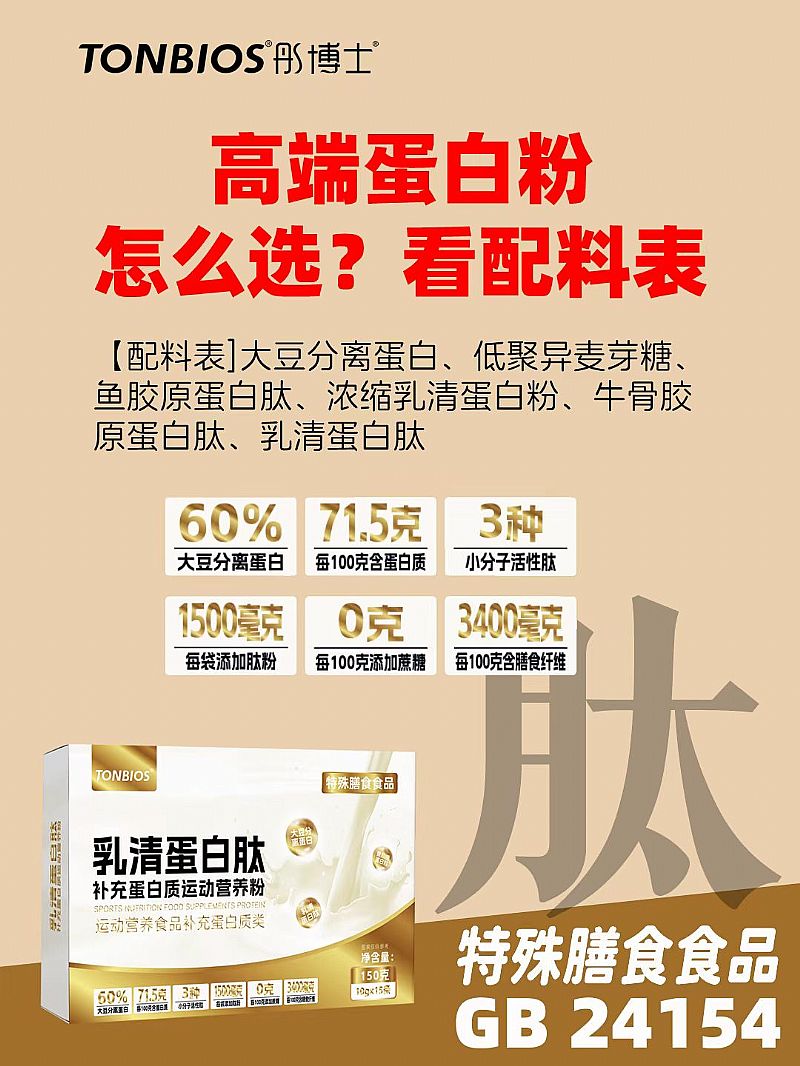 | 補充說明 | 動植物雙蛋白,營養(yǎng)更豐富 特別添加小分子肽,更易吸收 補充優(yōu)質(zhì)蛋白,鞏固健康防線 [配料表】大豆分離蛋白(60%)、低聚異麥芽糖、魚膠原蛋白肽(1500mg)、濃縮乳清蛋白粉、牛骨膠原蛋白肽(100mg)、乳清蛋白肽(100mg) |
