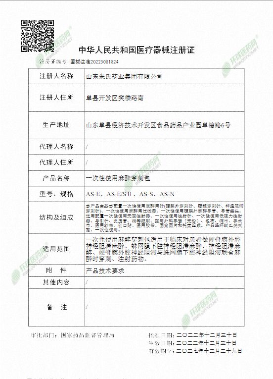 | 補(bǔ)充說(shuō)明 | 本產(chǎn)品由基本配置一次性使用麻醉用針(硬膜外穿刺針、腰椎穿刺針、神經(jīng)阻滯穿刺針)、一次性使用麻醉用過(guò)濾器、一次性使用硬膜外麻醉導(dǎo)管、導(dǎo)管接頭;選用配置一次性使用無(wú)菌注射器、一次性使用注射針、一次性使用低阻力注射器、導(dǎo)引針、負(fù)壓管、消毒液刷、醫(yī)用外科手套(無(wú)粉)、包布、洞巾、手術(shù)巾、醫(yī)用紗布、創(chuàng)口貼、醫(yī)用膠帶、固定圓片和托盤組成。產(chǎn)品經(jīng)環(huán)氧乙烷滅菌,一次性使用。 |