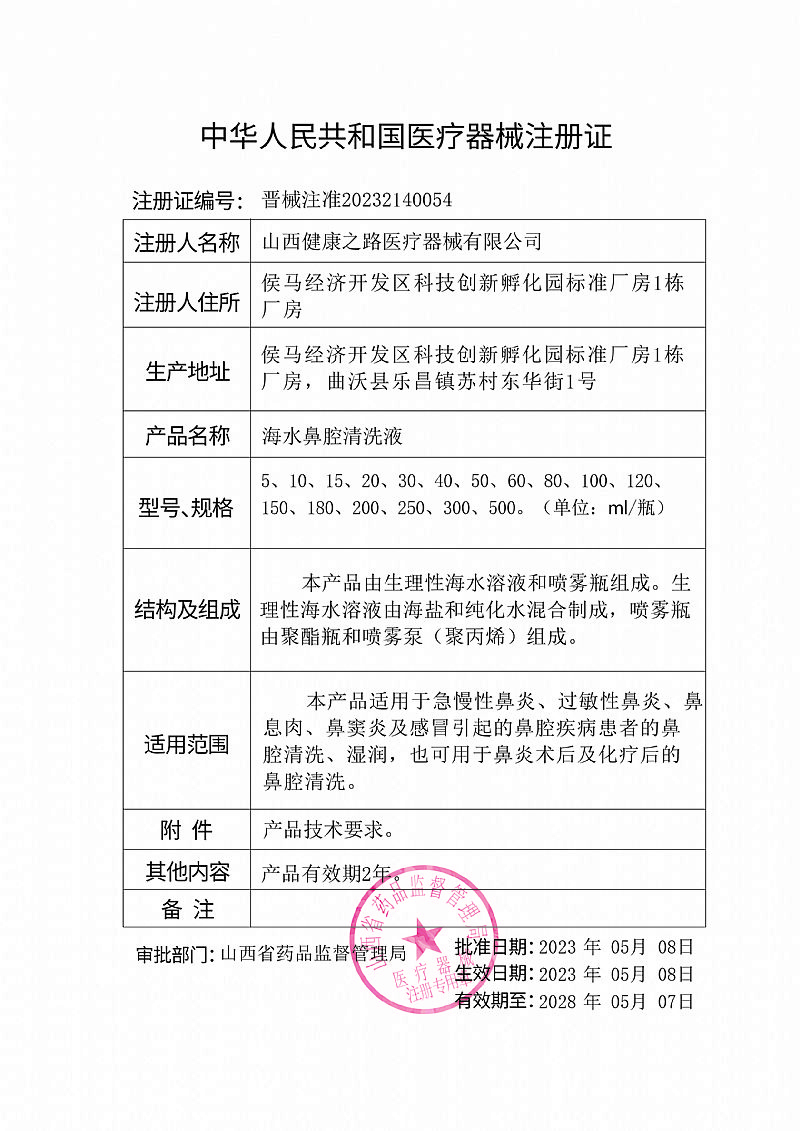 | 補(bǔ)充說明 | 【產(chǎn)品名稱】海水鼻腔清洗液 【型號(hào)、規(guī)格】5ml/瓶、10ml/瓶、15ml/瓶、20ml/瓶、30ml/瓶、40ml/瓶、50ml/瓶、60ml/瓶、80ml/瓶、100ml/瓶、120ml/瓶、150ml/瓶、180ml/瓶、200ml/瓶、250ml/瓶、300ml/瓶、500ml/瓶。 【結(jié)構(gòu)及組成】本產(chǎn)品由生理性海水溶液和噴霧瓶組成。生理性海水溶液由海鹽和純化水混合制成,噴霧瓶由聚酯瓶和噴霧泵(聚丙烯)組成。 【適用范圍】本產(chǎn)品適用于急慢性鼻炎、過敏性鼻炎、鼻息肉、鼻竇炎及感冒引起的鼻腔疾病患者的鼻腔清洗、濕潤,也可用于鼻炎術(shù)后及化療后的鼻腔清洗。 【產(chǎn)品性能】pH值為6.0-8.0。 【使用方法】 1.用于急慢性鼻炎、過敏性鼻炎、鼻息肉、鼻竇炎等鼻腔疾病患者的鼻腔清洗時(shí), 噴霧口對(duì)準(zhǔn)鼻孔,每次噴2-4下,每日三次,沖洗后將沖洗液擤出。 2.用于鼻腔沖洗及鼻腔手術(shù)后沖洗時(shí),將噴霧口對(duì)準(zhǔn)鼻腔用力按壓噴霧頭進(jìn)行沖洗,或?qū)_洗液倒入專用鼻腔沖洗器內(nèi)進(jìn)行鼻腔沖洗,噴出液體為霧狀,噴霧顆粒均勻一致。 【禁 忌 癥】 1.對(duì)本品過敏者禁用; 2.嚴(yán)重氯化鈉代謝障礙者禁用; 3.糖尿病人、精神病人、認(rèn)知障礙者、過敏體質(zhì)者慎用; 4.孕婦、兒童、體質(zhì)極度虛弱者慎用; 5.鼻腔大面積創(chuàng)傷者禁用; 6.活動(dòng)性鼻出血或既往易鼻出血者慎用。 【注意事項(xiàng)】 1.本品外用,嚴(yán)禁口服; 2.本品性狀改變時(shí)禁止使用; 3.孕婦、兒童在醫(yī)生指導(dǎo)下使用; 4.開封后30天內(nèi)使用; 5.如出現(xiàn)刺激或者發(fā)疹現(xiàn)象,請(qǐng)用清水沖洗,并停止使用。 【貯存】常溫儲(chǔ)存,避免陽光直射。 【運(yùn)輸】產(chǎn)品在運(yùn)輸過程中應(yīng)避免日曬、雨淋及重壓。 【配件清單】海水鼻腔清洗液、說明書。 【有 效 期】二年 【生產(chǎn)日期/生產(chǎn)批號(hào)】見外包裝 【醫(yī)療器械生產(chǎn)許可證編號(hào)】晉藥監(jiān)械生產(chǎn)許20200012號(hào) 【醫(yī)療器械注冊(cè)證編號(hào)】晉械注準(zhǔn)20232140054 【醫(yī)療器械產(chǎn)品技術(shù)要求編號(hào)】晉械注準(zhǔn)20232140054 【注冊(cè)人名稱/生產(chǎn)企業(yè)/售后服務(wù)單位】山西健康之路醫(yī)療器械有限公司 |