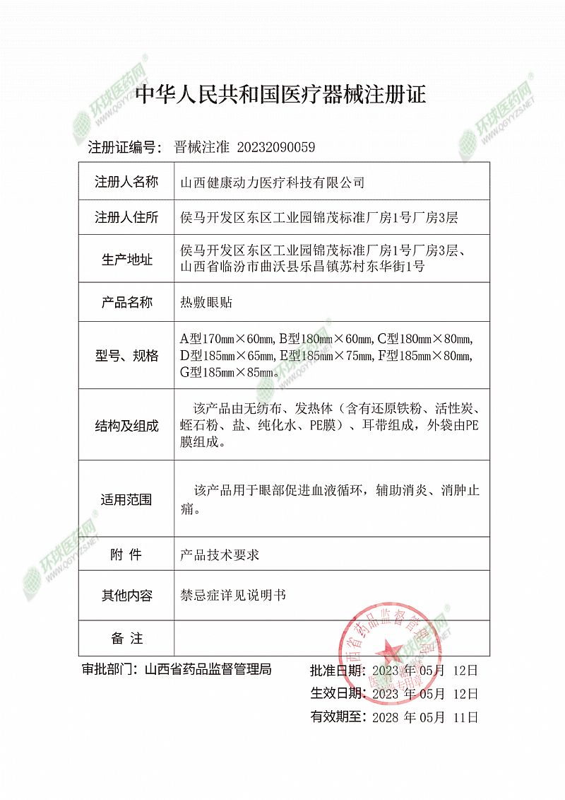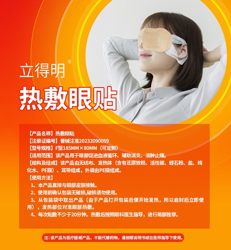 | 補(bǔ)充說明 | 熱敷眼貼說明書 【產(chǎn)品名稱】熱敷眼貼 【型號(hào)、規(guī)格】A型170mm×60mm,B型180mm×60mm,C型180mm×80mm,D型185mm×65mm,E型185mm×75mm,F(xiàn)型185mm×80mm,G型185mm×85mm。 【結(jié)構(gòu)及組成】該產(chǎn)品由無紡布、發(fā)熱體(含有還原鐵粉、活性碳、蛭石粉、鹽、純化水、PE膜)、耳帶組成,外袋由PE膜組成。 【適用范圍】該產(chǎn)品用于眼部促進(jìn)血液循環(huán)、輔助消炎、消腫止痛。 【產(chǎn)品性能】熱敷貼(袋)的內(nèi)外袋包裝整齊,不準(zhǔn)許破裂;印刷清晰,不得脫落;尺寸:應(yīng)符合標(biāo)識(shí)尺寸;溫度性能:升溫時(shí)間≤10min;溫度**時(shí)間大于等于持續(xù)時(shí)間的50%;40℃以上的持續(xù)時(shí)間≥10min;*高溫度≤57℃,*高溫度的平均溫度52±5℃。 【使用方法】 1、本產(chǎn)品直接與眼部皮膚接觸。 2、使用前確認(rèn)包裝無破損,破損請(qǐng)勿使用。 3、從包裝袋中取出產(chǎn)品(由于產(chǎn)品打開包裝后便開始發(fā)熱,所以啟封后立即使用),發(fā)熱部位對(duì)準(zhǔn)眼部熱敷。 4、每次貼敷不少于20分鐘。熱敷后按照眼科醫(yī)生指導(dǎo),進(jìn)行局部按摩。 【禁忌癥】 1、眼部皮膚破損、開放性傷口、急性閉合性損傷、結(jié)膜炎、虹膜炎、角膜炎以及72小時(shí)內(nèi)的結(jié)膜下出血和眼底出血的患者禁用。 2、感覺障礙、化膿性感染及急性期炎癥患者,惡性腫瘤、活動(dòng)性結(jié)核、精神類患者,皮膚病、嚴(yán)重糖尿病、高熱患者及對(duì)產(chǎn)品材質(zhì)過敏者禁用。 3、佩戴心臟起搏器者、合并有心腦血管、肝、肺、腎和造血系統(tǒng)等嚴(yán)重原發(fā)性疾病者;精神病患者;孕婦及哺乳期婦女;體質(zhì)極度虛弱者、兒童及對(duì)溫度變化不太敏感的患者使用應(yīng)遵醫(yī)囑。 【注意事項(xiàng)】 1、使用前打開包裝袋,若包裝破損,請(qǐng)勿使用。 2、本品為一次性使用產(chǎn)品。即開即用,不使用請(qǐng)勿開袋,請(qǐng)勿重復(fù)使用。 3、因個(gè)體皮膚敏感性存在差異,使用過程中感覺溫度偏高或其他不適,請(qǐng)暫停使用,防止皮膚燙傷。 4、患有眼底出血,顱內(nèi)出血、青光眼及眼部損傷或腫脹者請(qǐng)勿使用。 5、使用本品前后15分鐘,請(qǐng)勿使用眼藥水,若佩戴隱形眼鏡,請(qǐng)先摘下后再使用本品。 6、嬰幼兒、孕婦禁用;請(qǐng)將本產(chǎn)品放在兒童接觸不到的地方。 7、熱敷眼貼的溫度和發(fā)熱時(shí)間會(huì)因使用環(huán)境不同而有變化。 8、使用本產(chǎn)品如有不適,請(qǐng)暫停使用或遵醫(yī)囑。 9、兒童必須在成人監(jiān)護(hù)下使用。 10、非專業(yè)用戶應(yīng)在醫(yī)生的指導(dǎo)下使用。 【有效期】 二年 【生產(chǎn)日期/生產(chǎn)批號(hào)】 見外包裝 【貯存】應(yīng)貯存在通風(fēng)干燥、無腐蝕性氣體的室內(nèi)。 【運(yùn)輸】產(chǎn)品在運(yùn)輸過程中應(yīng)避免日曬、雨淋及重壓。 【配件清單】熱敷眼貼、說明書 【醫(yī)療器械生產(chǎn)許可證編號(hào)】晉食藥監(jiān)械生產(chǎn)許20160009號(hào) 【醫(yī)療器械注冊(cè)證編號(hào)】晉械注準(zhǔn)20232090059 【醫(yī)療器械產(chǎn)品技術(shù)要求編號(hào)】晉械注準(zhǔn)20232090059 【注冊(cè)人名稱/生產(chǎn)企業(yè)】山西健康動(dòng)力醫(yī)療科技有限公司 |