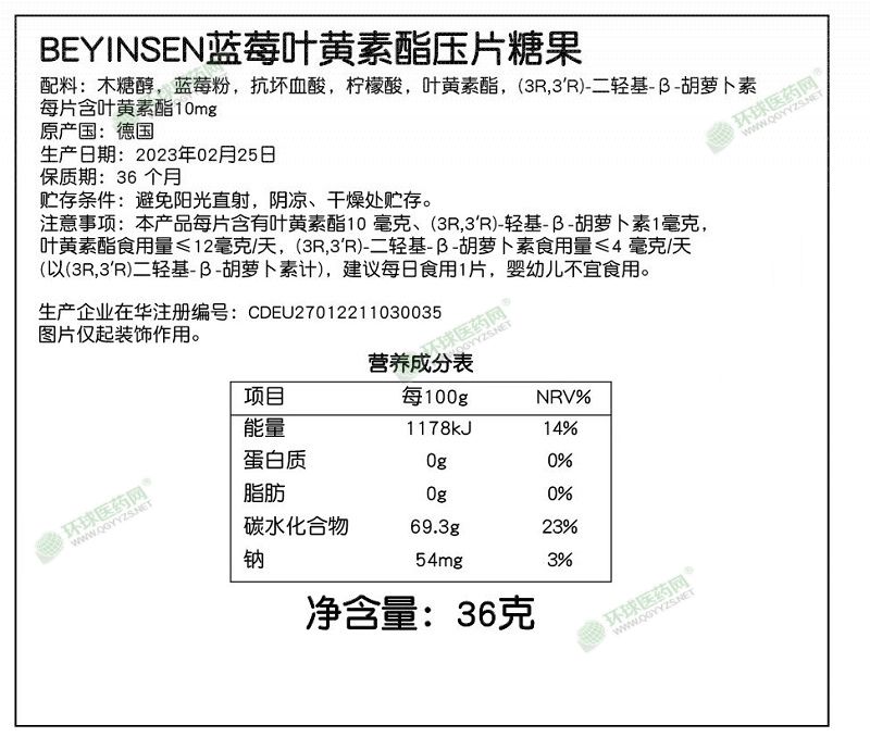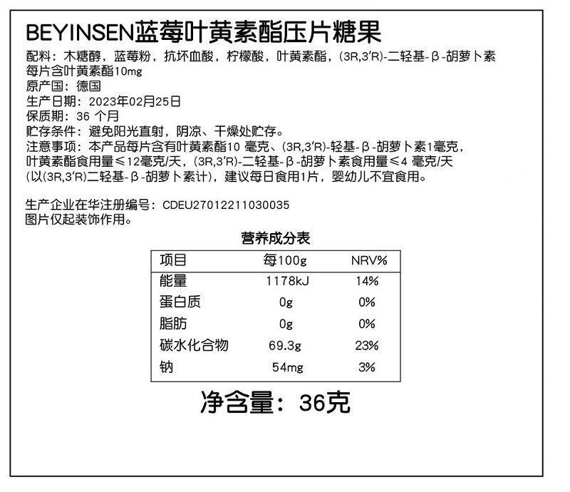 | 主要成分 | 配料:木糖醇,藍莓粉,抗壞血酸,檸檬酸,葉黃素酯,(3R.3'R)-二輕基-3-胡蘿卜素 每片含葉黃素酯10mg |